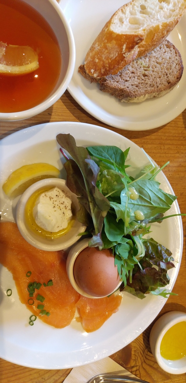 セットメニューと単品の飲み物をお願いしました。量は控えめですが、バランス良く朝からいただくには理想的なものでした。ストロベリーラテが春の限定でありました。時間をたっぷり使ってのんびりいただく場所です。九時近くには、パンをメインのテラス席はかなり空いていました。