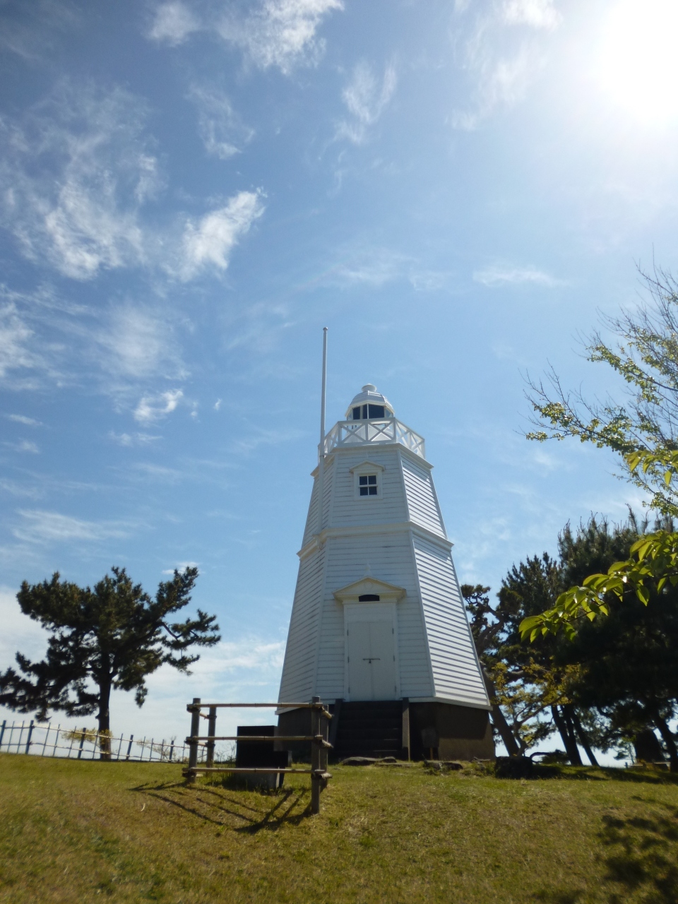 明治28年、宮野浦に初めて洋式木造六角灯台が建てられたそうです。昭和33年には近代式灯台が完成し、役目を果たし、この日和山公園に移築されたそうです。公園内の少し高くなったところからは、この六角灯台越しに最上川や酒田港、日本海を眺めることができます。