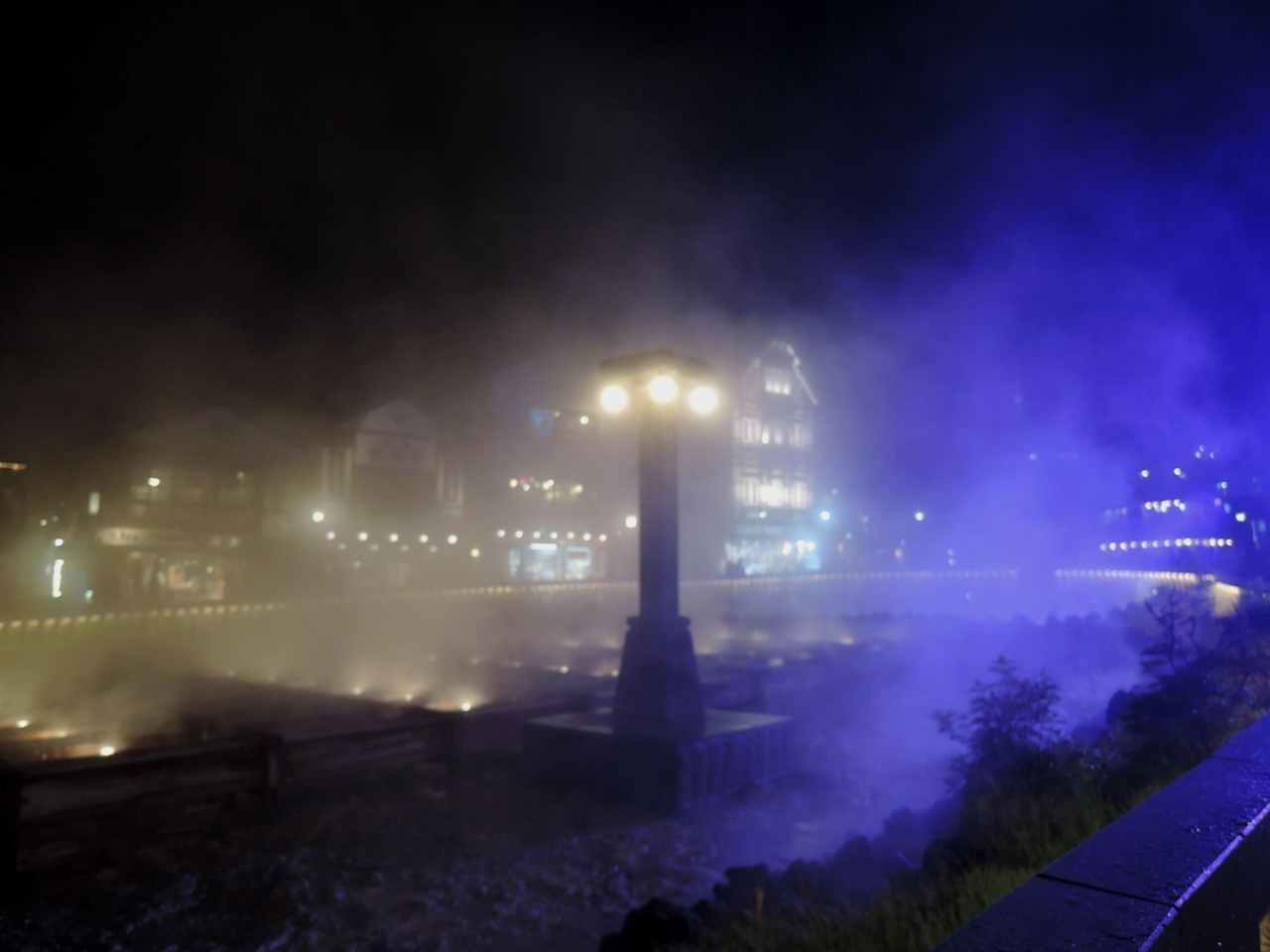 草津温泉といえば、岡本太郎氏がデザインした湯畑が有名です。日中も足湯があったり、硫黄の香りを感じながら散策するのも楽しいですが、夜は湯けむりの中色んな色に変わるイルミネーションが幻想的で素晴らしいです。
