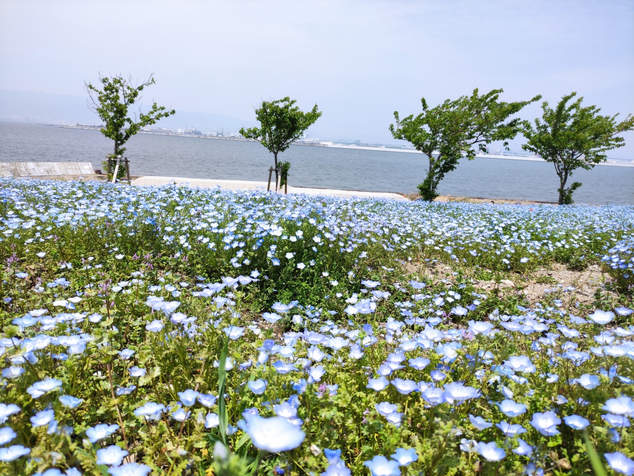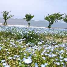 クルマで行くと大渋滞との話でしたので、電車・バスで行きました。JRゆめ咲き線の桜島駅でバスに乗りましたが、ハイシーズンだったので数台分の待ち時間がありました。開けたシーサイドの一面にブルーのネモフィラが咲いていてとてもきれいでした。