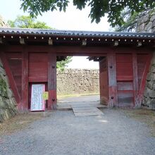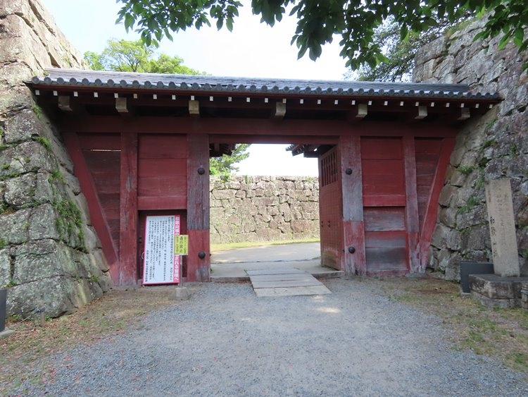 なかなか不思議な名まえの城門ですね。和歌山城の西口にあたる門で、17世紀前半の寛永年間に創建された高麗門です。空襲による被災を免れた貴重な和歌山城の遺構です。砂の丸の乗馬調練場と門外の扇の芝馬場を結んでいることからこの名になりました。約40年前の解体修理で朱に塗られていたことが判明したそうですが、その理由としては和歌山城の裏鬼門(南西)に位置することから除災のため、という説が有力です。