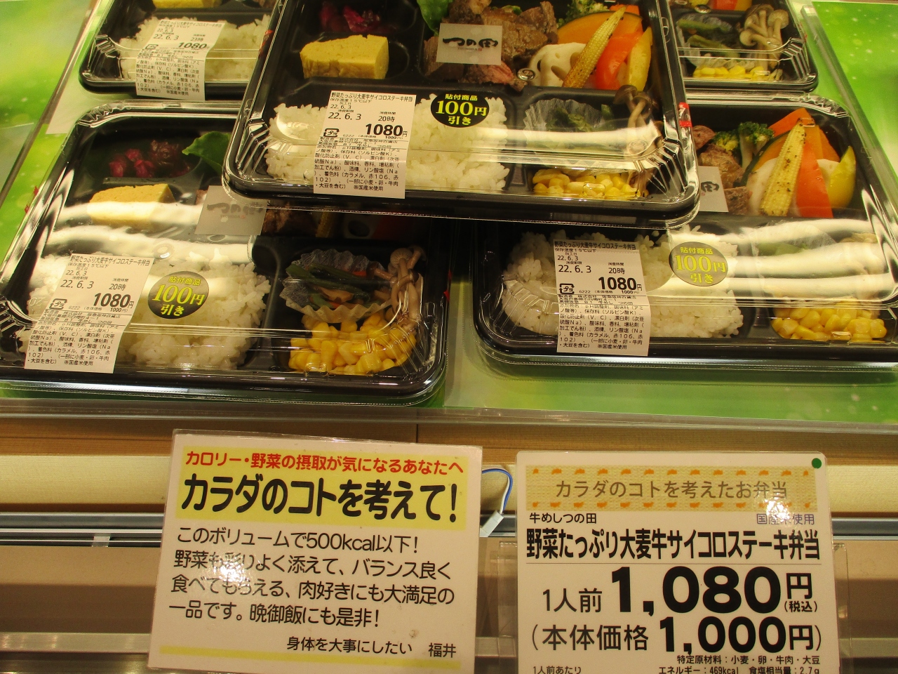 高槻阪急の地下にお店があります。牛めしやステーキなどお肉のお弁当がメインです。訪れた時は「野菜たっぷり大麦サイコロステーキ弁当」などもありました。ボリュームがありヘルシーなところにも惹かれます。次々売れていっていました。