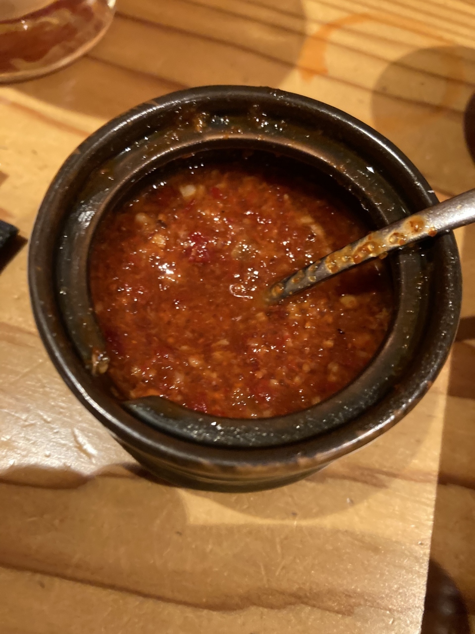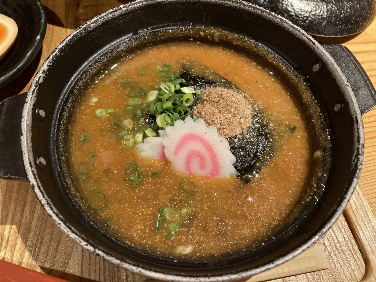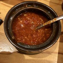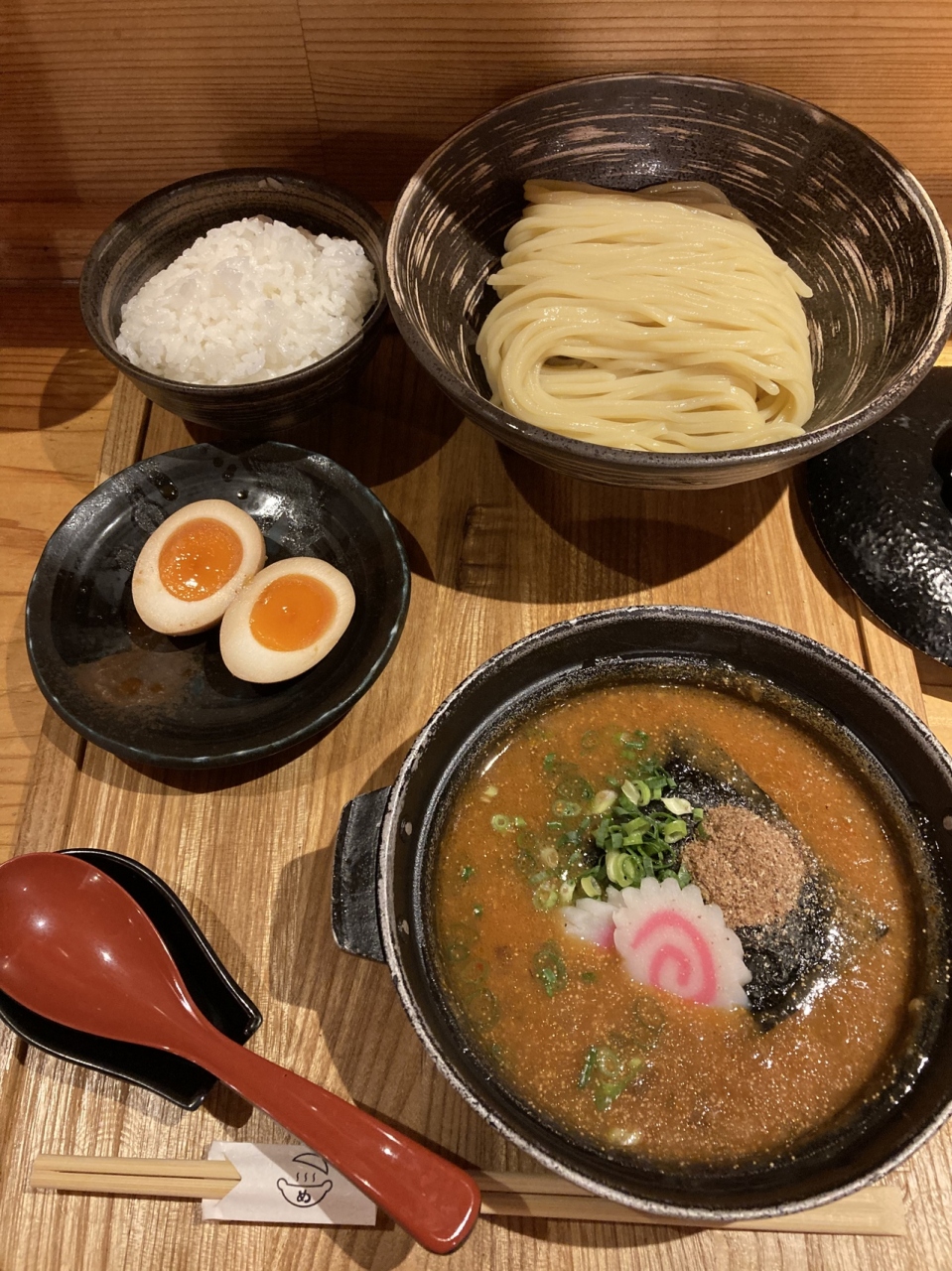 明太子一本にあごや昆布の出し汁、さらにトマトをはじめ数十種類の野菜と煮込んだ漬け汁は、明太子のぷつぷつとした食感が残り美味。海苔、ナルト、魚粉と小ネギが入っていて、かなり濃厚。明太子ベースの辛味ダレを入れるとさらに美味。この辛味ダレは、ご飯に数滴かけて食べても美味。ただかなり辛いので、かけ過ぎないことが大事。麺は少し硬めに茹でられた太麺で、小麦の香りのするもので、濃厚な漬け汁に負けない麺。〆にご飯をつけ汁に投入し、リゾットに。まず、旨味を引き出す割にりスープを入れ、ご飯を入れる。スープのおかげで、旨味がさらに感じられ、つけ麺とはまた違った味わい。税込で1700円以上なので、少し高め。ただ、これまでに食べたことのない味で、また食べたい。
