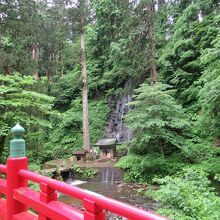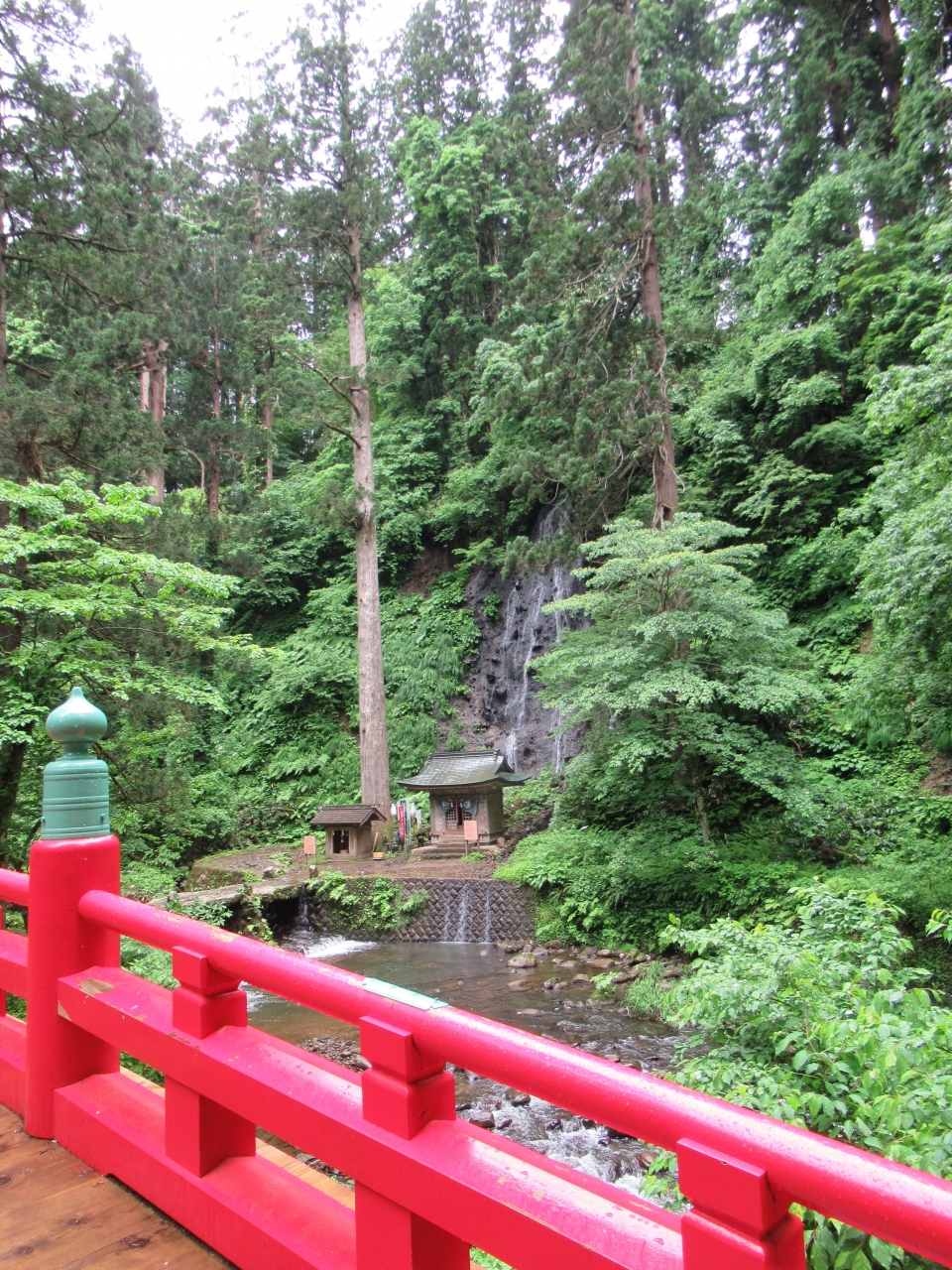 羽黒山の入口にあたる随神門から下り階段を通って5分ほど、赤い神橋近くで水音を響かせ流れ落ちる滝です。江戸時代に月山の麓から水をひいて作られたもので、滝の水が流れ入る祓川で参拝者は身を清め、山頂に向かったそうです。緑の中に浮かび上がる赤い神橋と白いしぶきの須賀滝、その手前に建つ祓川神社はカメラに納めたくなる景観です。