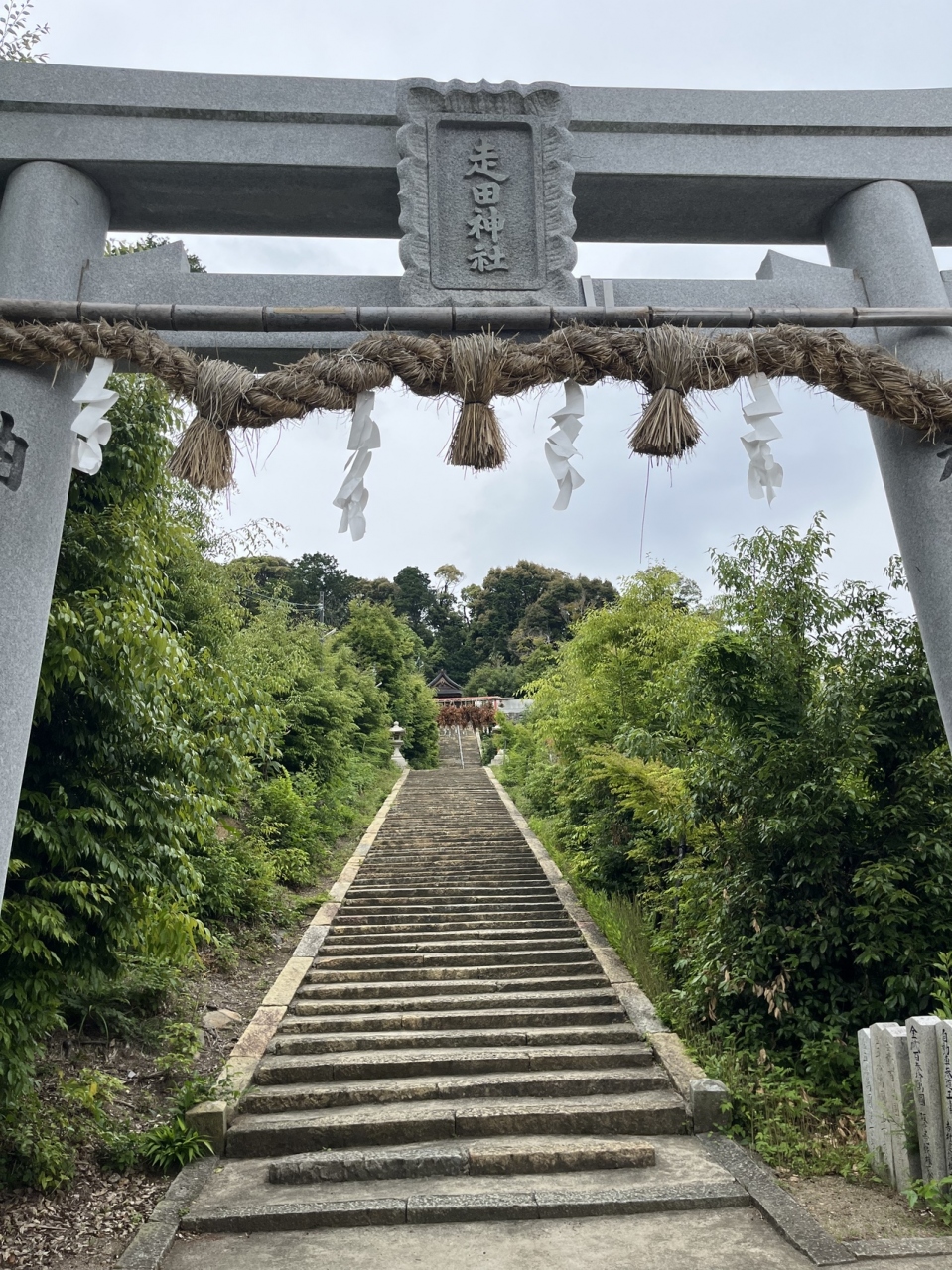 京都西山地区の古刹として知られている、楊谷寺から長岡天神へ歩いている途中に立ち寄りました。周りは田畑で無人の販売所などが点在する長閑な田園風景が広がっています。神社の石段を登ると、市内を一望できます。