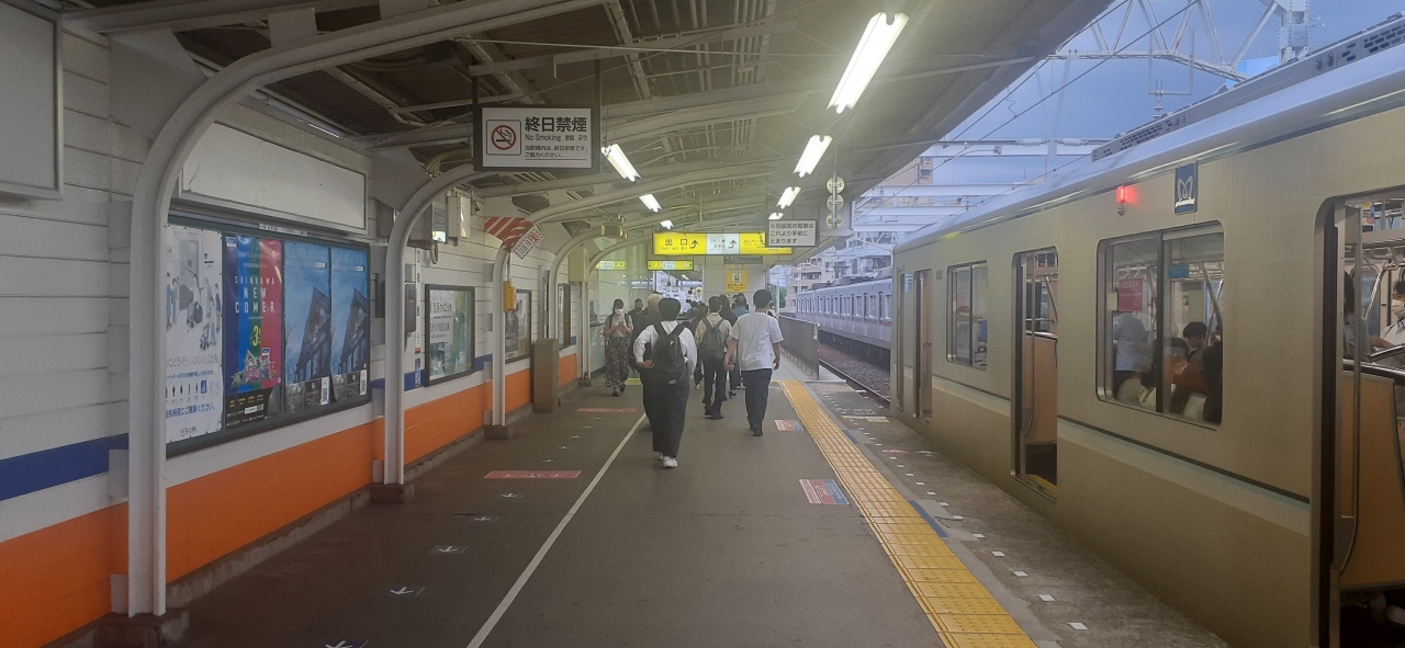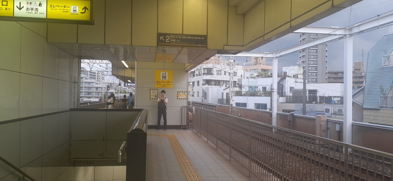 この駅は少し変わっていて、1本のホームがとても長く、千鳥式で上下の電車のホームがあります。