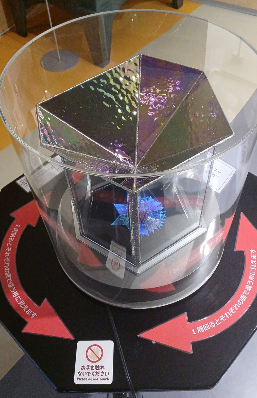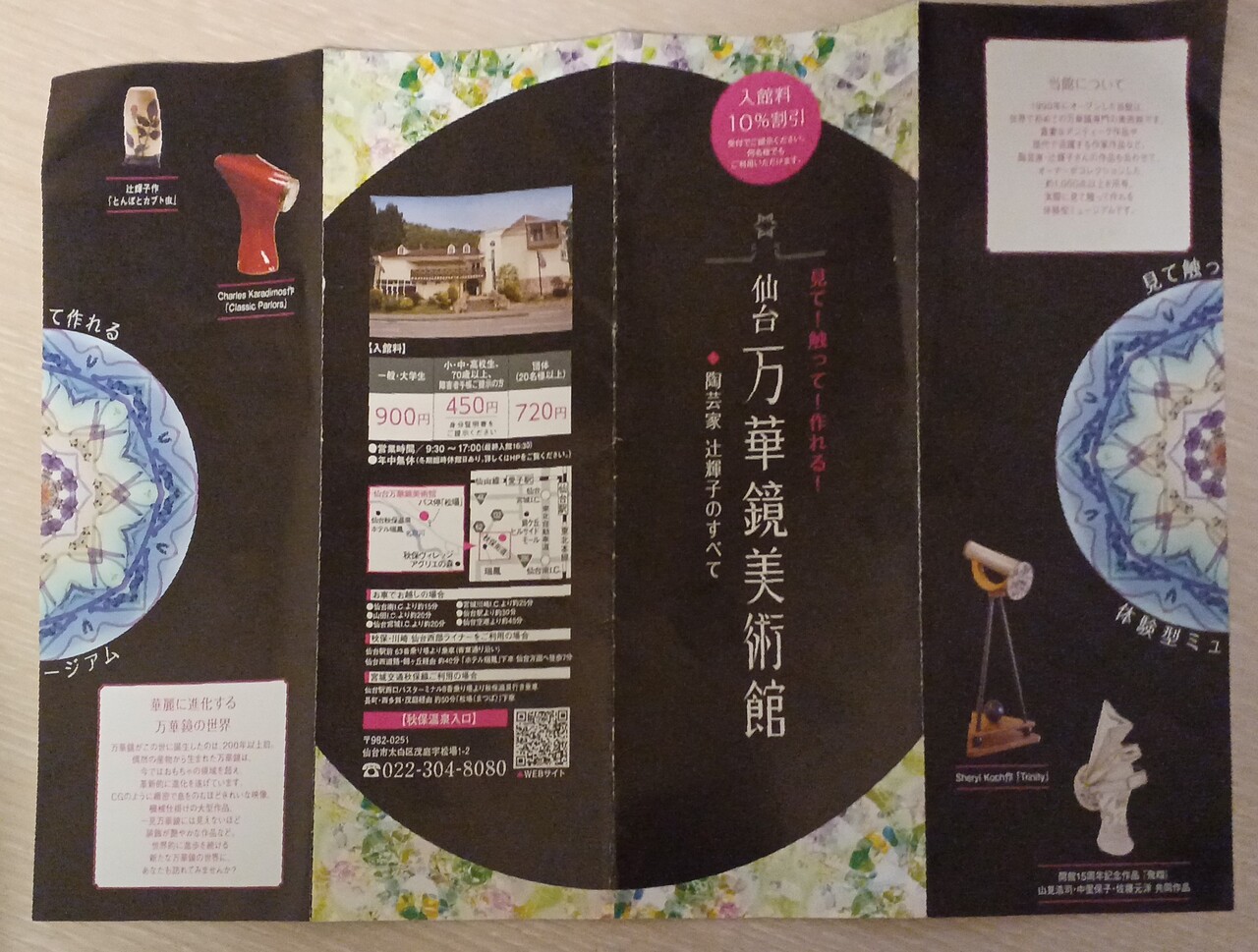 秋保にある万華鏡美術館。入館料は大人900円だが、HPに1割引クーポン券が載ってるので提示して810円に。ビニール手袋(SMLから選択)を渡される。メイン会場の2階で撮影できるのは第一展示場のみ。係の方がほどよい距離感で説明してくださり、実際に何点もの万華鏡に触れられる。(ビニール手袋ははめなくて直接触ってよいですよと声を掛けて頂いた)。万華鏡作家の山見さん(世界大会で何度も優秀作品を作られている方)の作品が特に素晴らしかった。