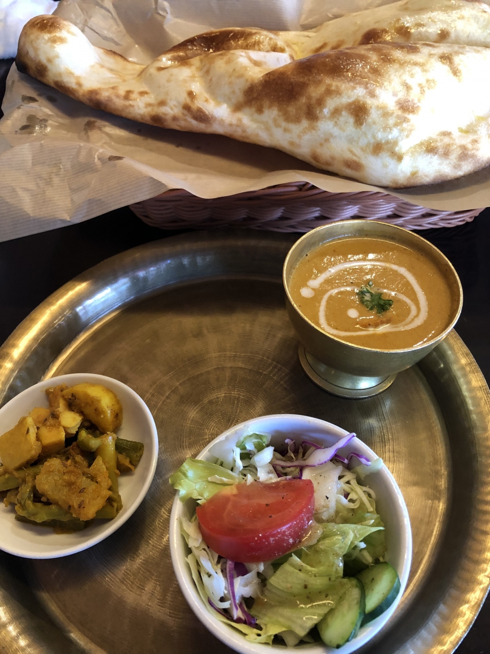 阪急宝塚駅から宝来橋を渡って徒歩5分ほどにカレー屋さんが2件あるうちの奥の店です。ランチに行ったとき2階はほぼ満席でにぎわっていました。ランチはナンつきのスリヤランチ990円を楽しました。とても大きなナンで辛さ3でも甘めのカレーでした。
