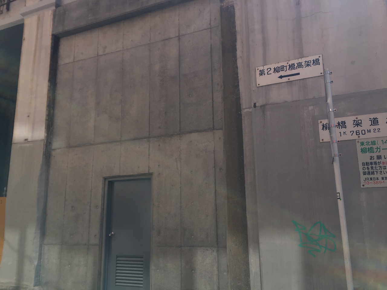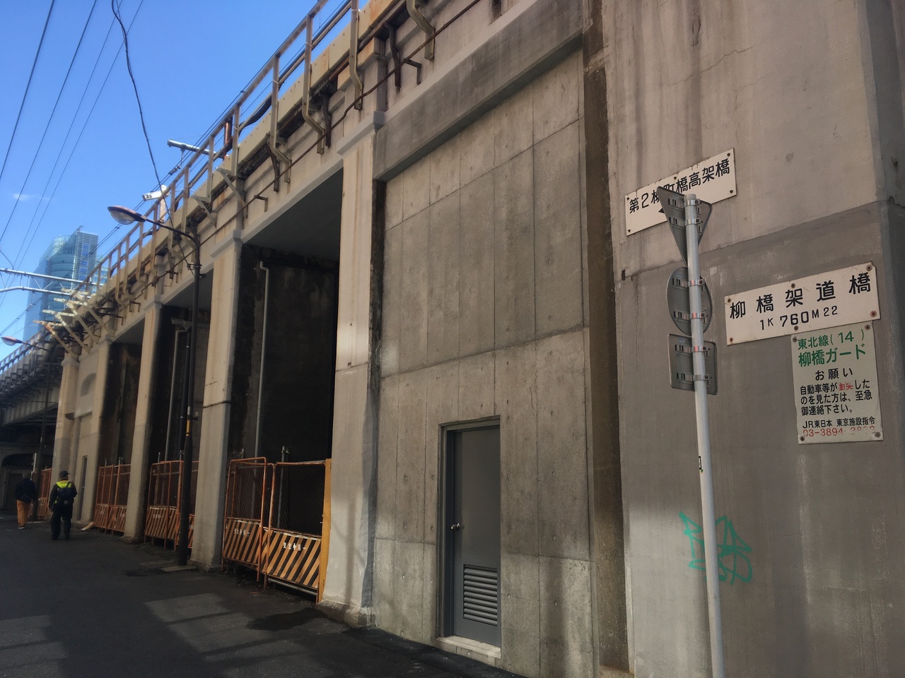 柳原通り架道橋と柳橋架道橋の間の高架部分が第2柳町橋高架橋です。つまり柳原通りと須田二仲通りの間にあります。補修工事?がほぼ終了したようでコンクリートがきれいにうたれていました。高架橋ができたのが大正12年ということですから、100年の間、日本の主要な鉄道の大動脈を支えてきた高架線だと知り感動しました。