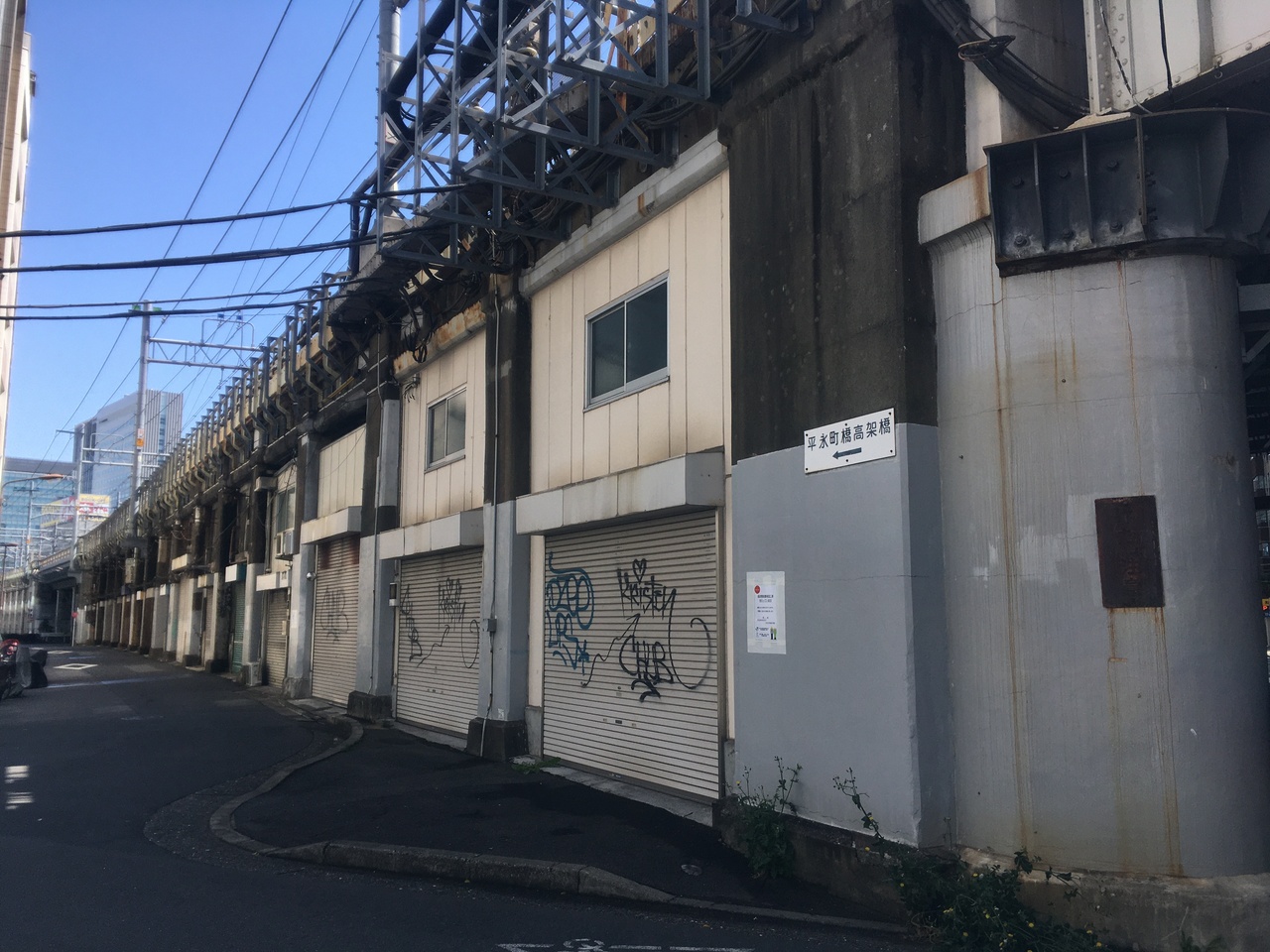 「一ハ通り」と「靖国通り」の間の高架部分が「平永町橋高架橋」です。高架下は倉庫や事務所として使われているようですが、コンクリート壁面やシャッターには落書きがされクーラーの室外機が雑然としており、ちょっと寂しい感じです。神田駅近くの赤煉瓦の壁面の高架橋とは違い残念です。