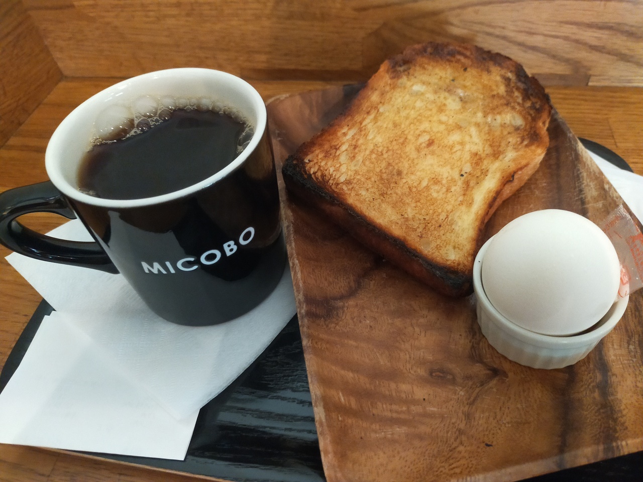 モーニングセットはパンが若干焦げて見えますが、バターが染み込んていて、美味しく頂きました。コーヒーもこだわってるようで、粉売りもしていました。