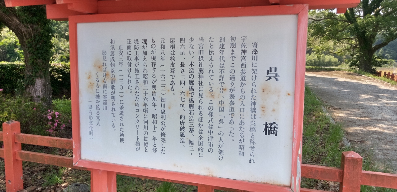 宇佐神宮にお参りに行った時に、出来るだけ近い場所に車を止めようとしていて、ちょうど呉橋の手前に駐車場を見つけました。川に架かる橋の全景は、うっとりするほど優美で、とても見る価値があると思いました。昔はここが表参道だったと、案内板にも書かれていて、偶然とはいえとても良いお参りになりました。