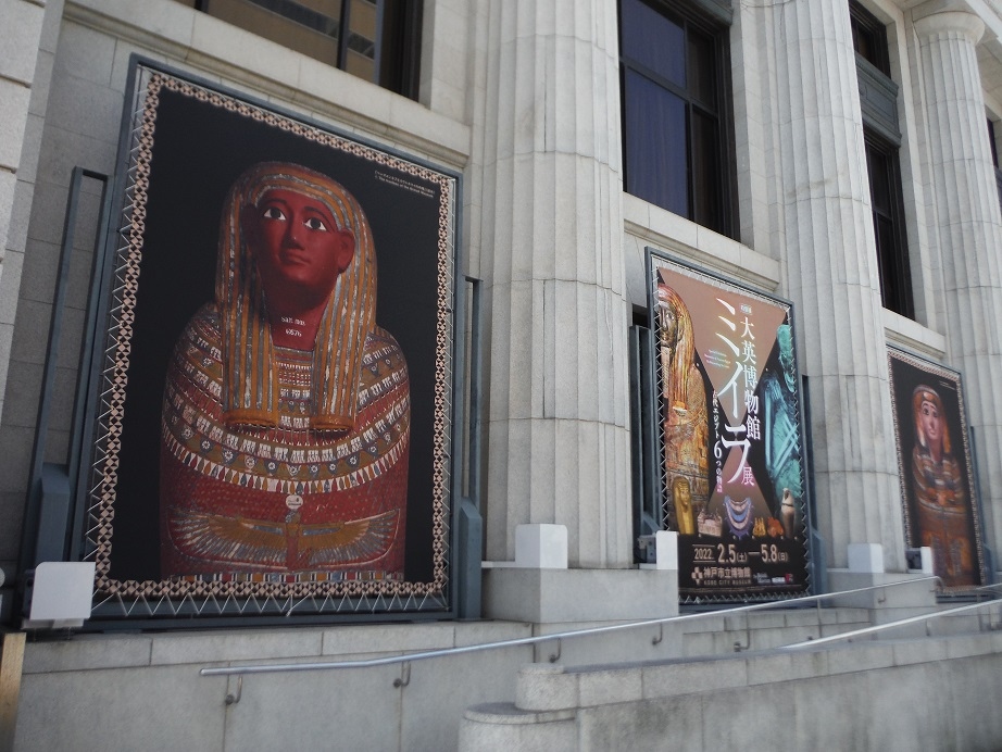 神戸市立博物館のミイラ展に行きました。博物館は旧横浜正金銀行神戸支店ビルが転用されていて国の有形登録文化財になっています。平日のお昼にネットで来場予約をしていきましたが待ち時間なくすんなり入れました。ただ、会場内はそれなりに混みあっていました。一部ですが写真可能の展示室もありました。常設の神戸の歴史のコーナーもみられます。