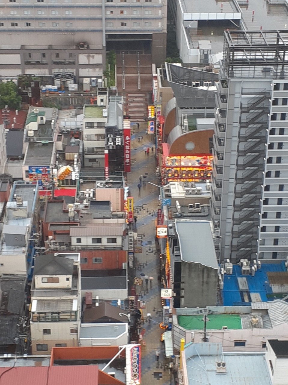 大阪ミナミでも観光客に人気のディープな大阪エリアです。大阪名物の「ソース2度づけ禁止」の串揚げの居酒屋が通りに集中しています。通天閣から歩いて1分ほどです。地元客より観光客が多いです。通天閣からは直下の通りを見渡せます。