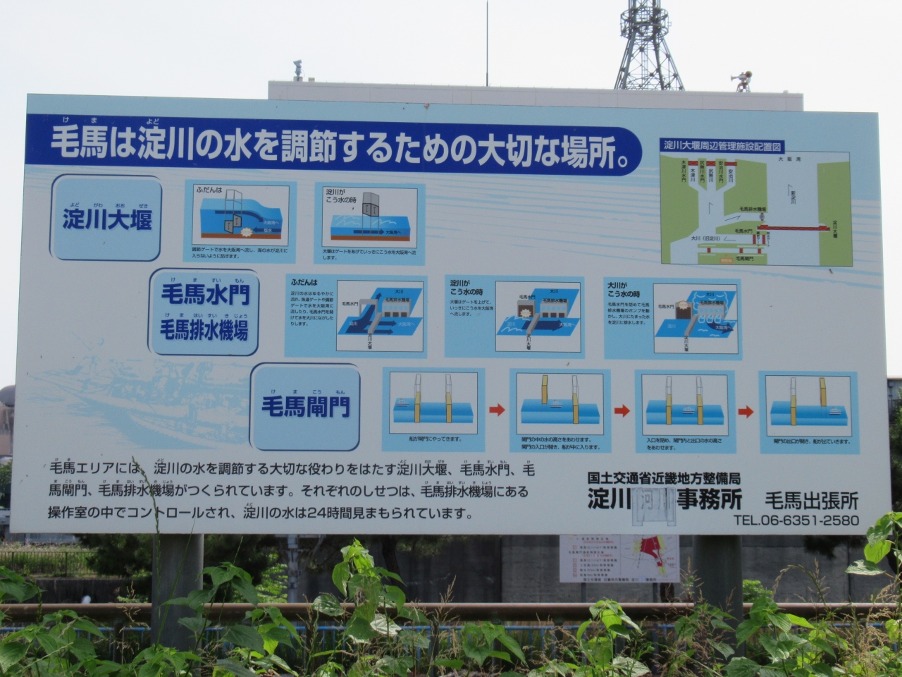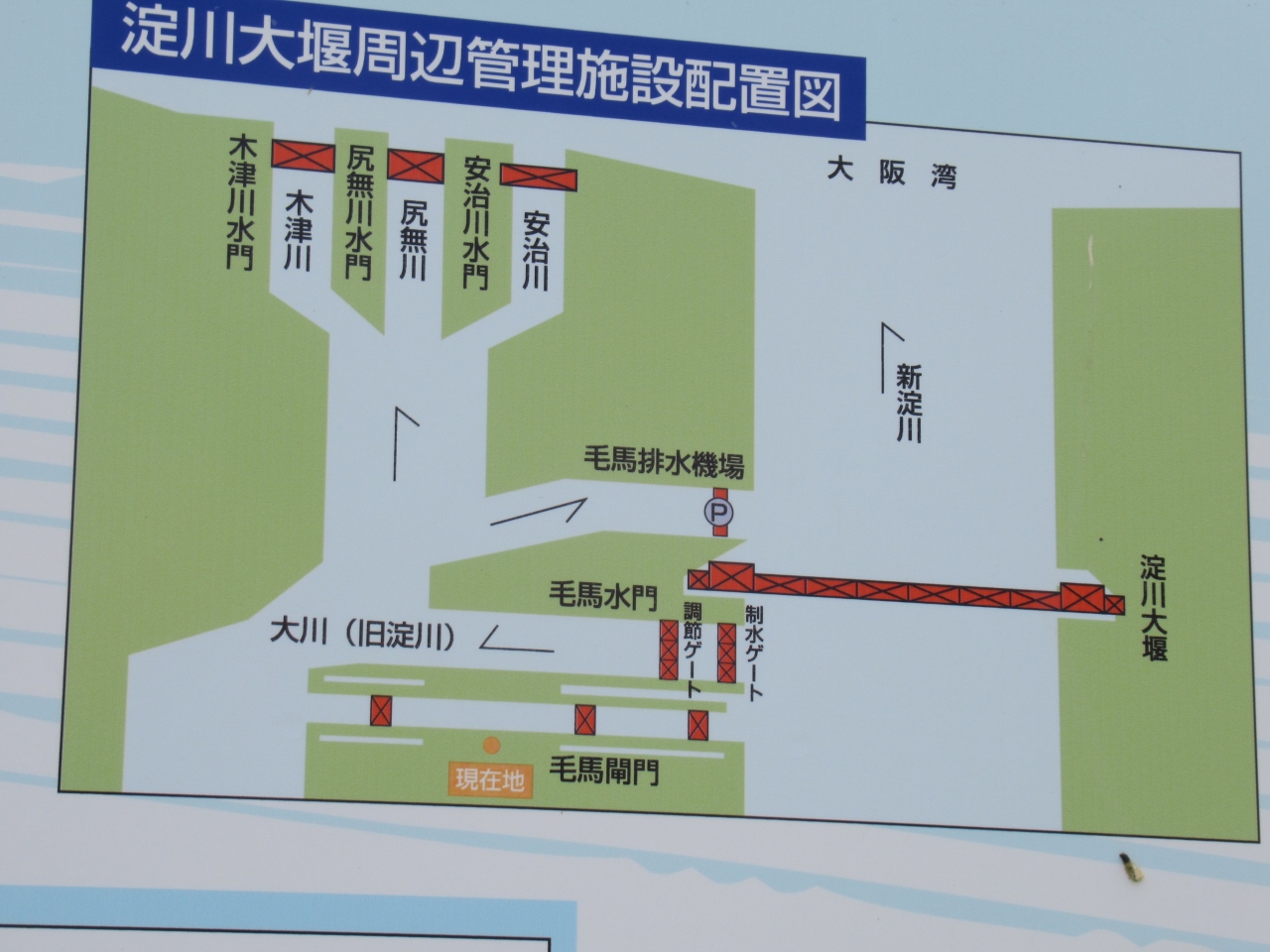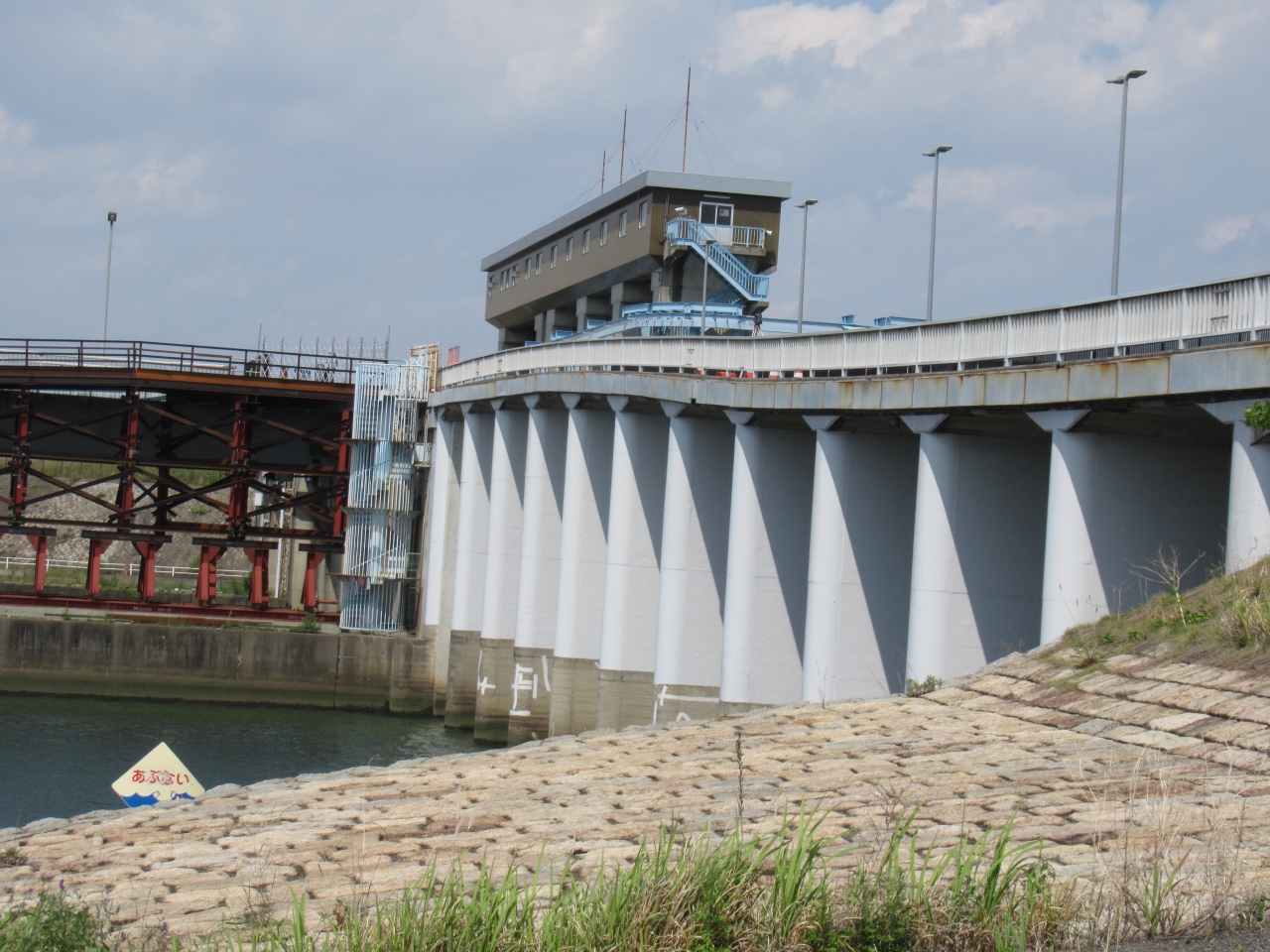 大川に流れる水量を調整する役目と同時に、淀川と大川の水位差により困難となる船舶の通過をスムーズにさせるための設備である閘門と大川の水を強制排水するための機能を備えています。