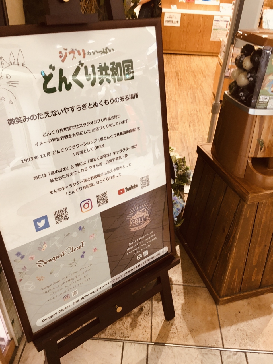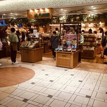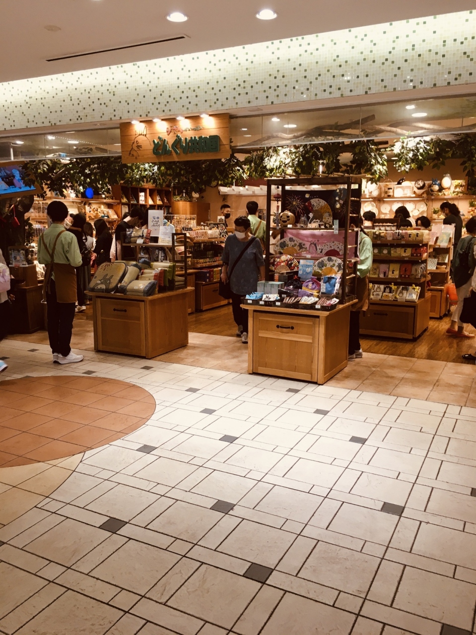 たくさんの店が連なるエリアの中でも比較的広めの店舗でした。天井からは葉っぱが、ぶら下がり森をイメージした店舗のようでした。出入口正面には扇子等、外国人が喜びそうな和風の品が置いてあります。タオル、皿等もありました。