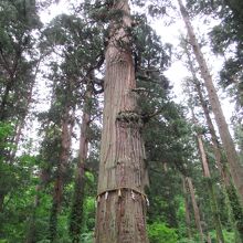 出羽三山神社社務所から随身門を通り、8分ほど杉並木を歩くと太く高い杉があります。樹齢推定1000年以上で幹囲8m余りの国の天然記念物です。周囲の杉が華奢に見えるほど堂々とした神秘的な巨木です。強い生命力を感じます。昔は婆杉もありましたが、1902年の暴風でなくなりました。爺スギは災害に倒れることなく存在し続けて欲しいです。