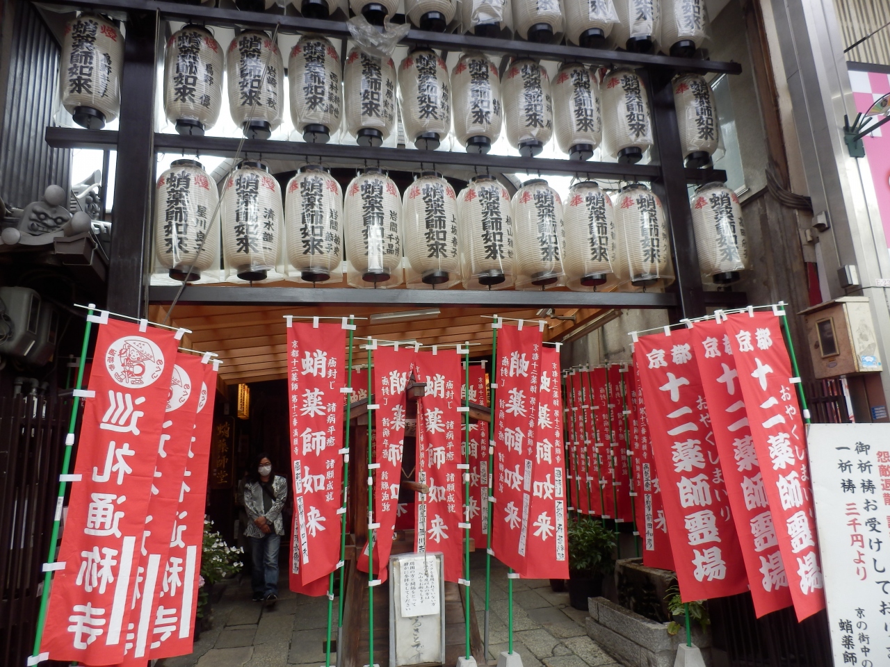蛸に由来する伝説で名高い浄瑠璃山永福寺にあるお堂、京都最大級の繁華街である新京極通にあり観光客で参拝者が多数お参りしている、御本尊は薬師如来、京都十二番薬師霊場会の十二番に属している、御門前には蛸が参拝者を迎えているような風景が見られる
