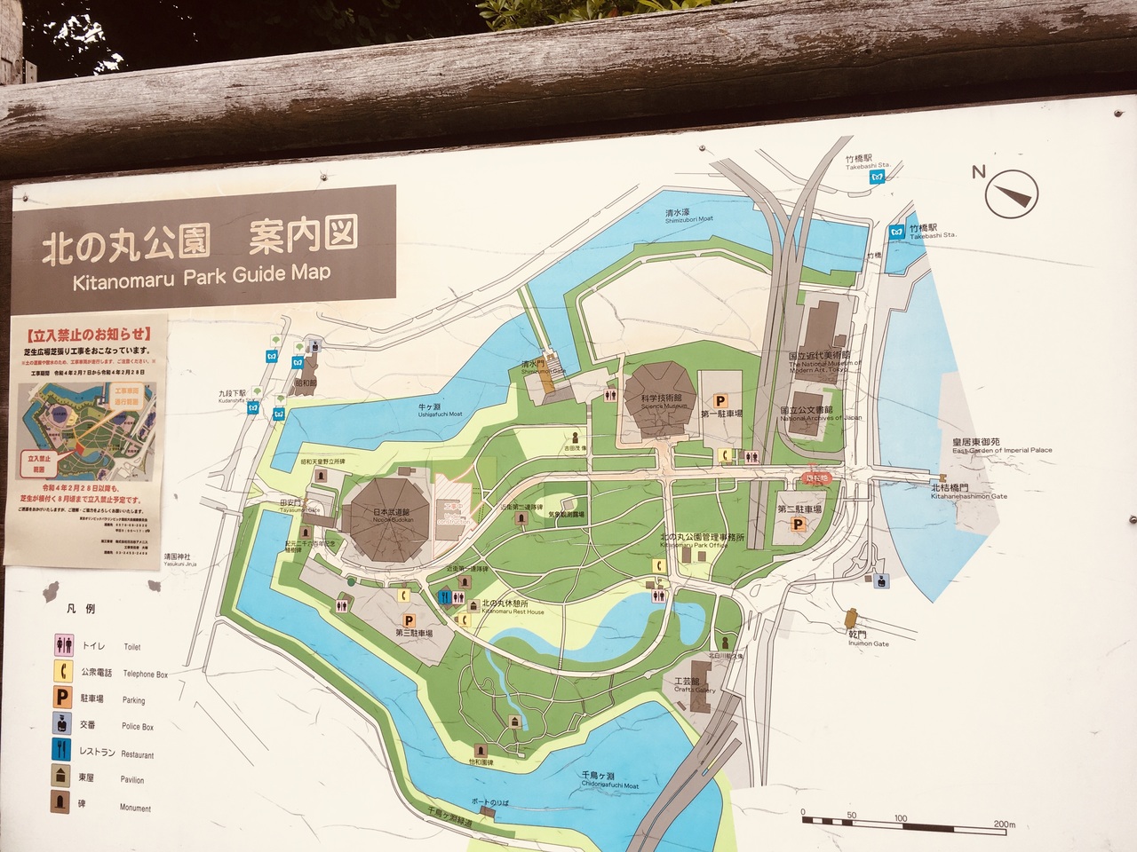 皇居の濠や淵に囲まれた大きな公園で、遊歩道になっていて木々がたくさんありました。国立近代美術館、日本武道館、科学技術館等大規模施設もあり、駐車場もいくつかありました。散歩に適した公園で、警察官も見かける場所でした。