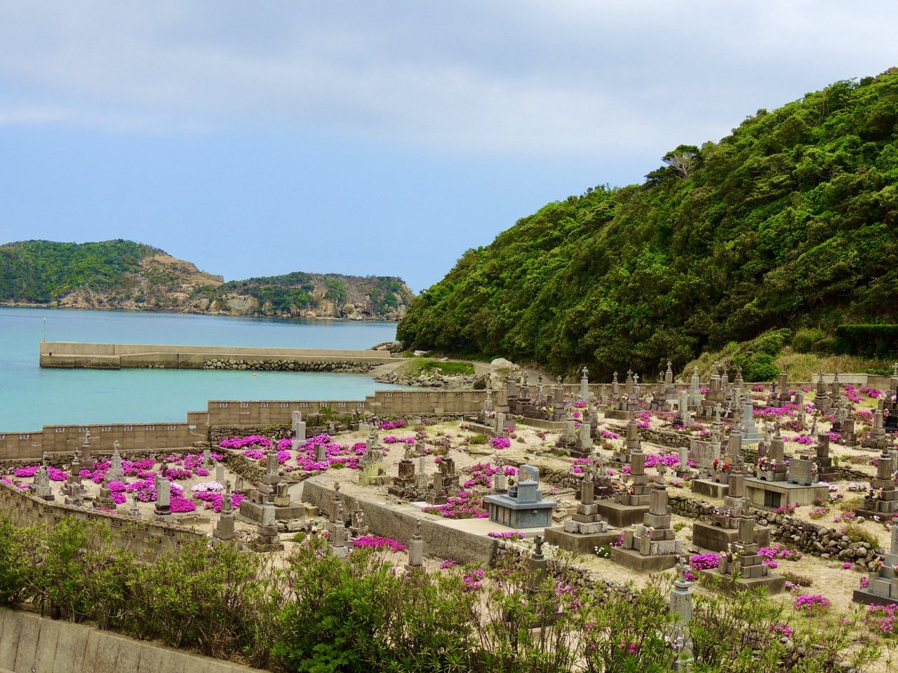 禁教期に外海から移住してきた潜伏キリシタンの墓地です。もともと頭ヶ島は無人島で、病人の療養地だったところで、墓地は綺麗な白浜を臨む場所にありました。あまりに海岸に近いので、台風などは大丈夫かと心配になりました。