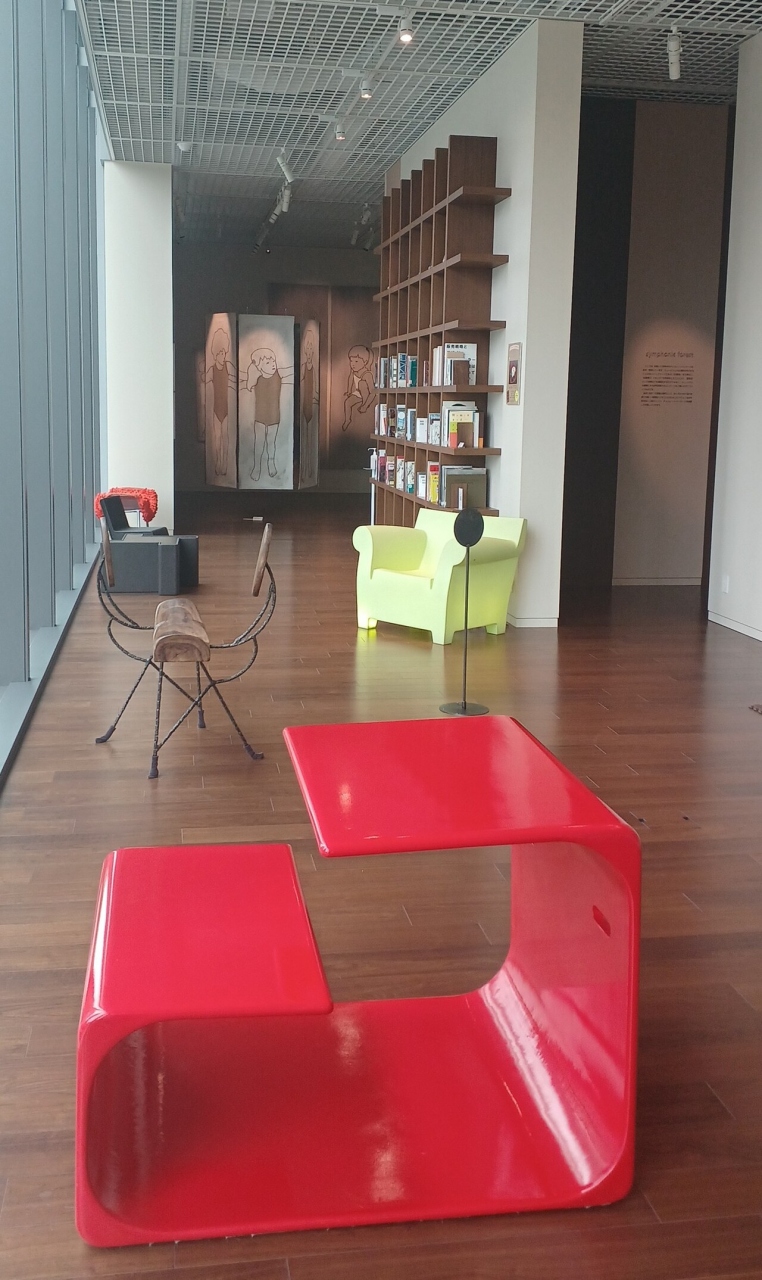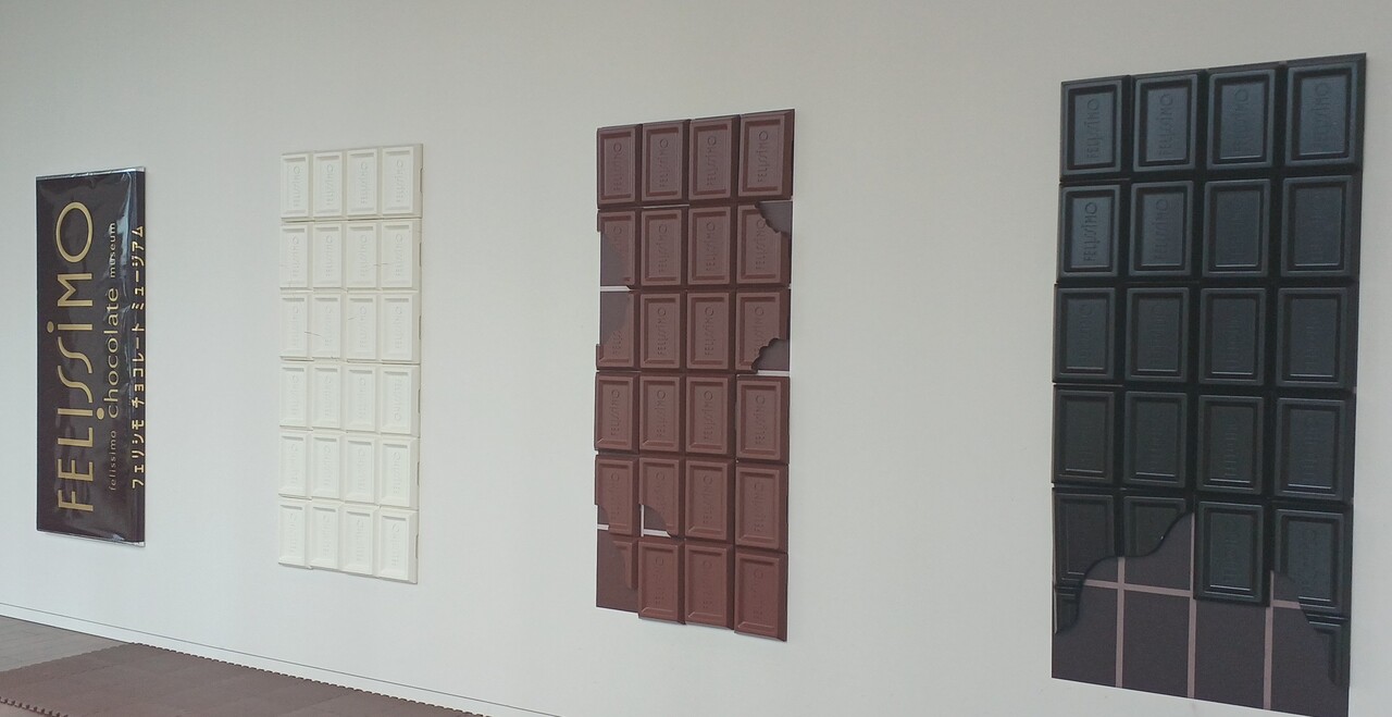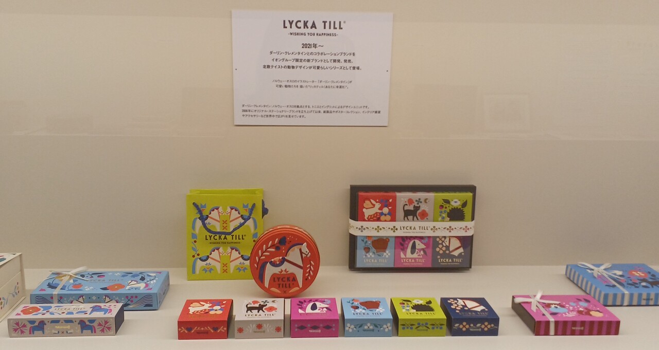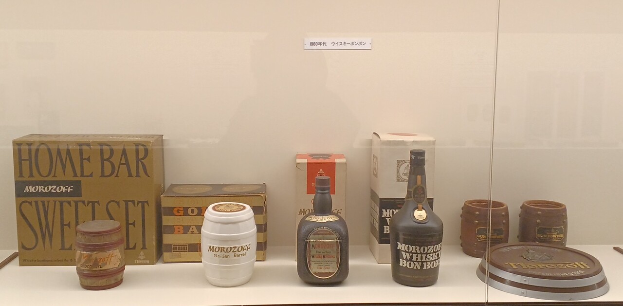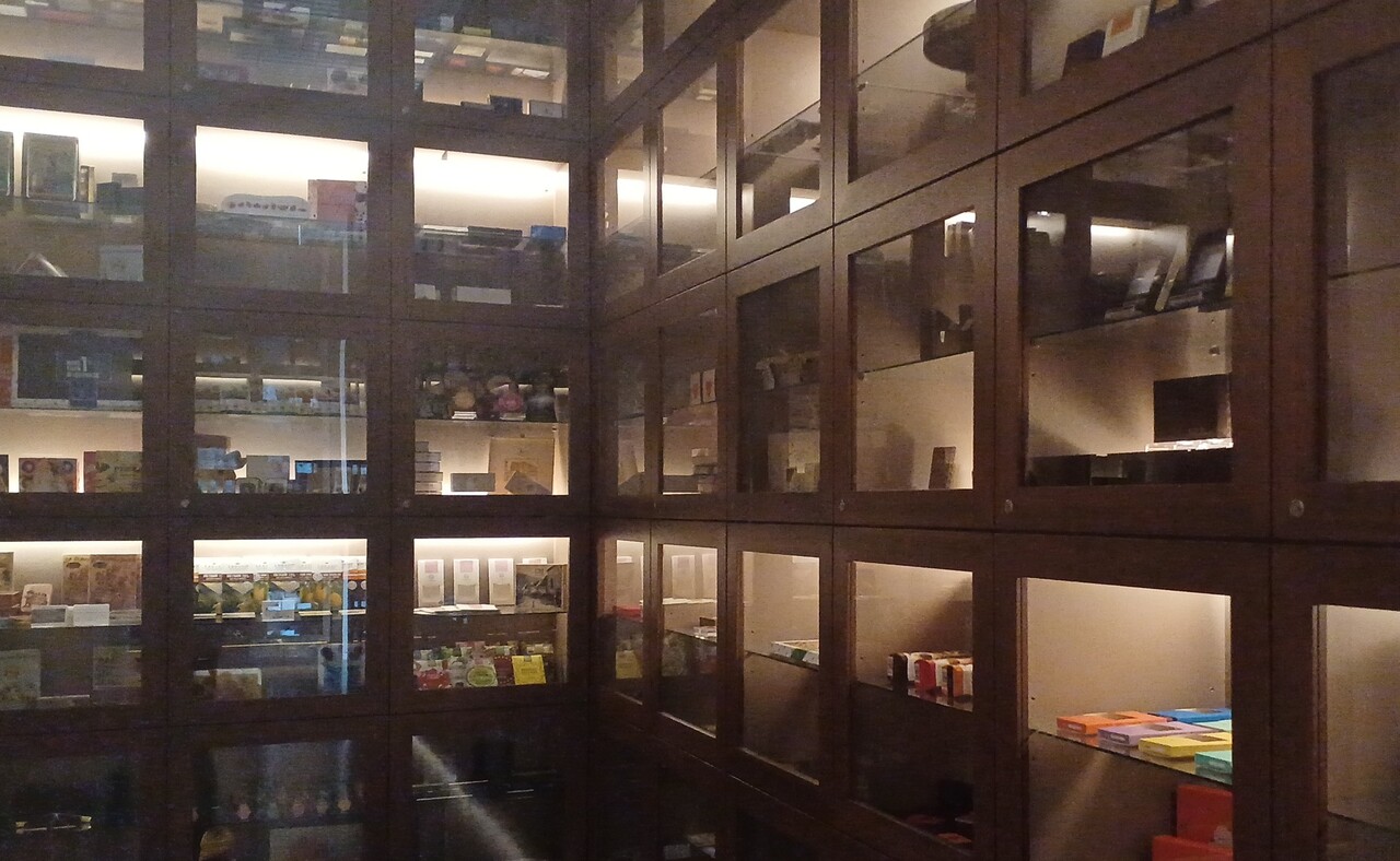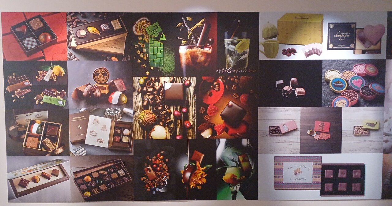 歴代のモロゾフのパッケージゾーンは明るいイメージ。その次は天井高くまでブースごとに分かれてチョコレートのパッケージがずらり。