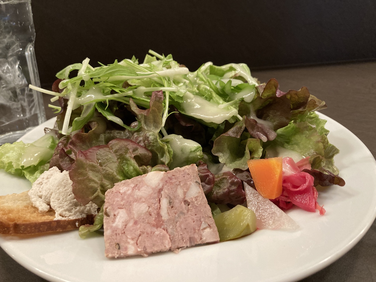 葉っぱ物だけではなく、パテ、パプリカのピクルスなども加わり、彩りも良く、添え物ではないちゃんとしたサイズのサラダ。