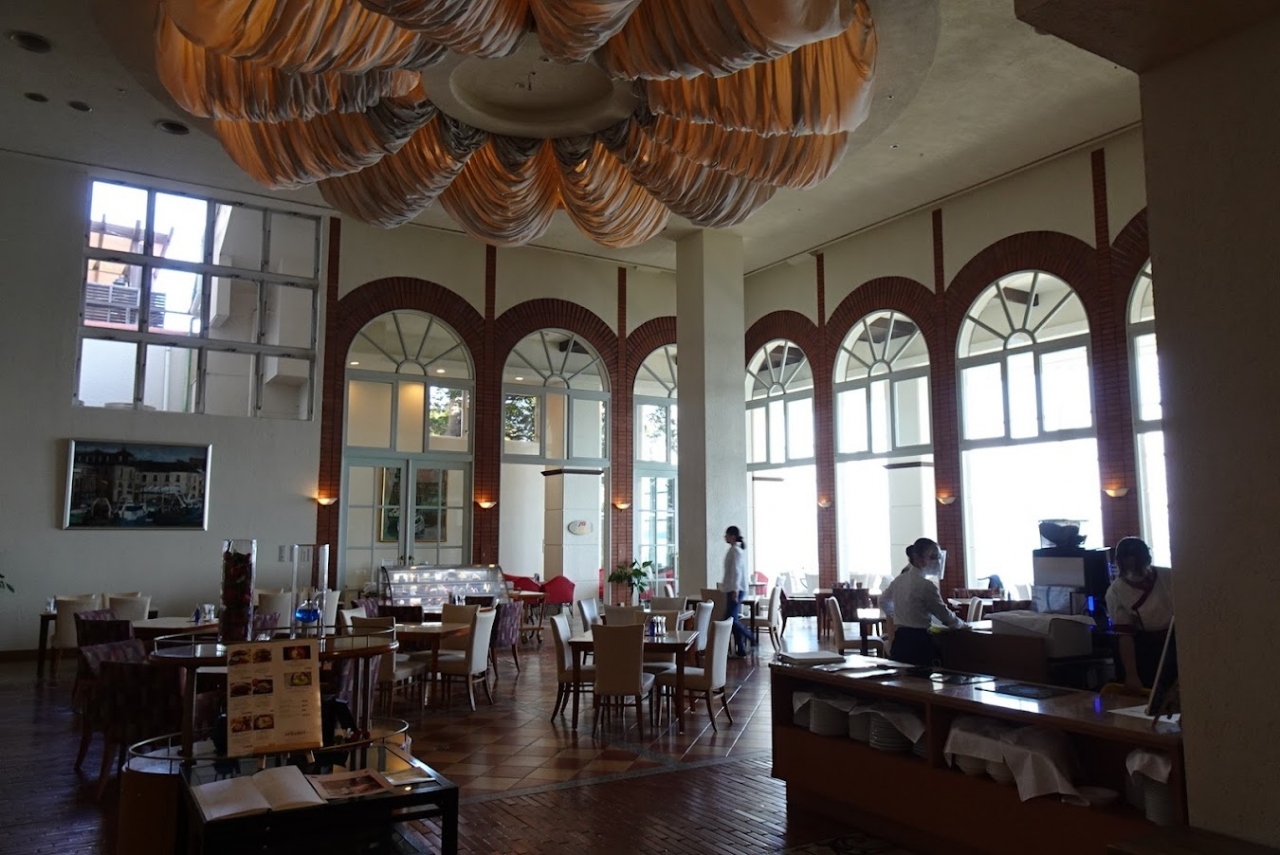 天井が高く、ガラス越しの海も綺麗で絶景の中食事ができます。