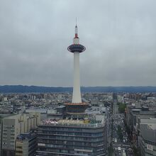 京都グランヴィアホテルの、最上階の客室のベランダに出て、見上げた京都タワーです。昼間のタワーも、白色に輝いていて、きれいでした。また、夜もライトアップされて、様々な色に彩られていて、うっとりと眺め入りました。