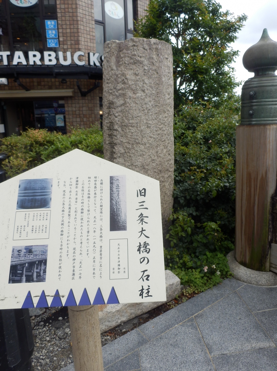 橋脚を石材で造った三条大橋、その石柱が一部保存されている。秀吉の命で京都三条大橋の建て替え時に橋脚を石材を使用し永久利用できるように施工した、三条大橋の擬宝珠に基礎は五尋に埋める、などと刻まれている、この石柱の一部が三条大橋西詰北側に保存されている 三条通から直接見ることが出来る