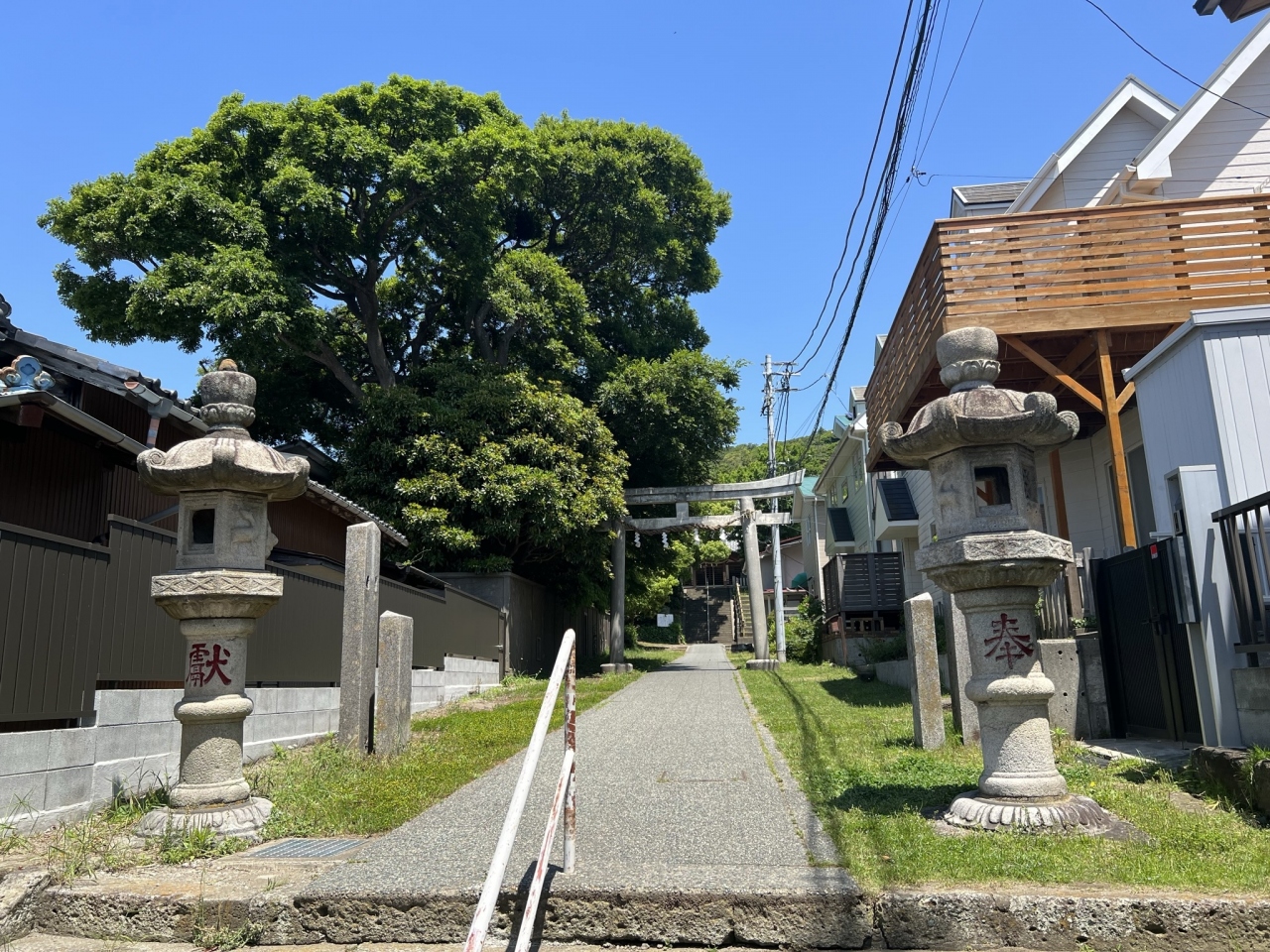 葉山御用邸から300mほど北、住宅の間に参道があり、奥にある本殿までまっすぐと伸びています。創建は749年という古い歴史のある神社で、創建時からる今日に至るまで行合祭(三十三年大祭)という神事が継承されています。スサノオノミコトが森山社に降りてきて数日間滞在するという神事で、次の行合祭は令和10年に行われます。社殿前の広場には、行合祭や例大祭などの様子が、写真パネルで紹介されています。