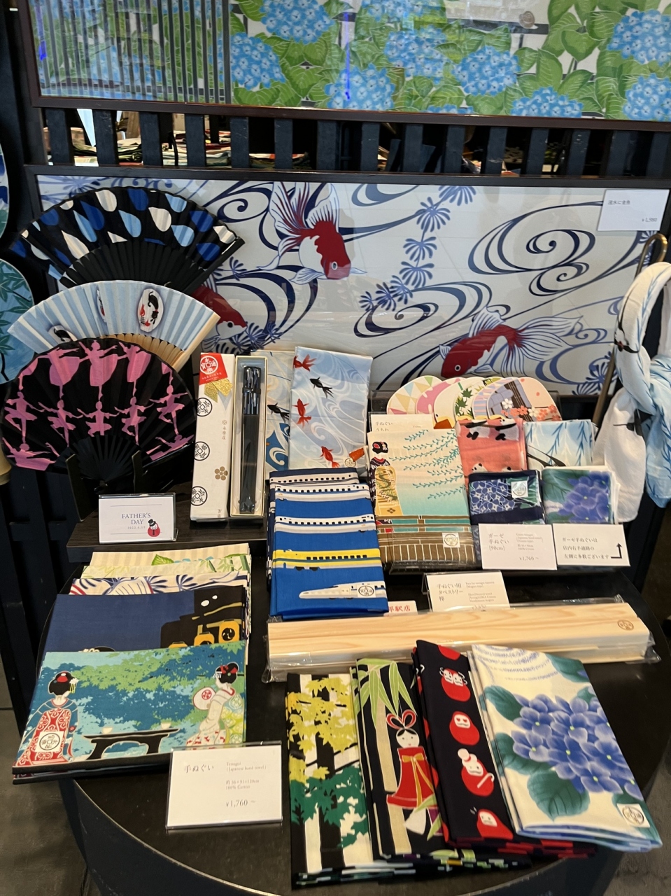京都らしいステキなデザインの「手ぬぐい」が いろいろ 並んでいます。