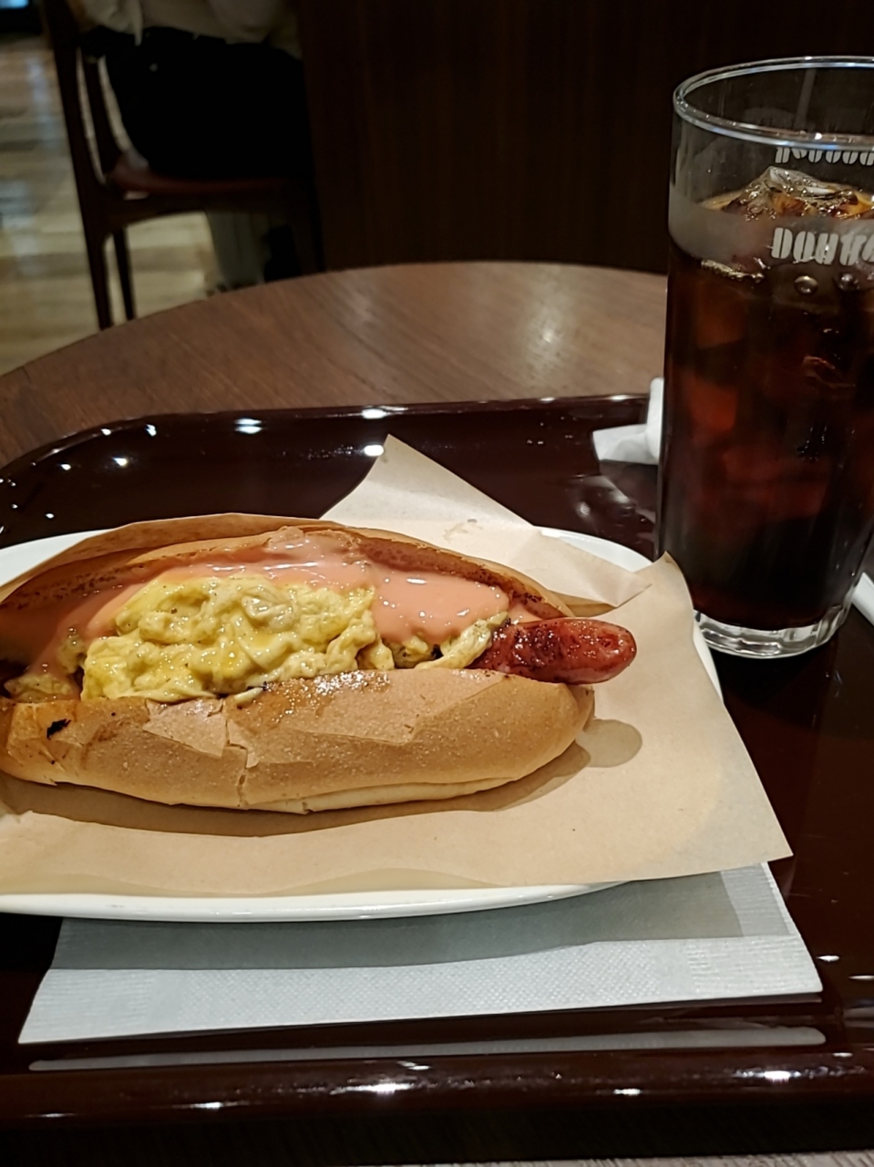 500円のモーニングはドリンクと6種類のホットドッグから選びます。私はスクランブルエッグ。
