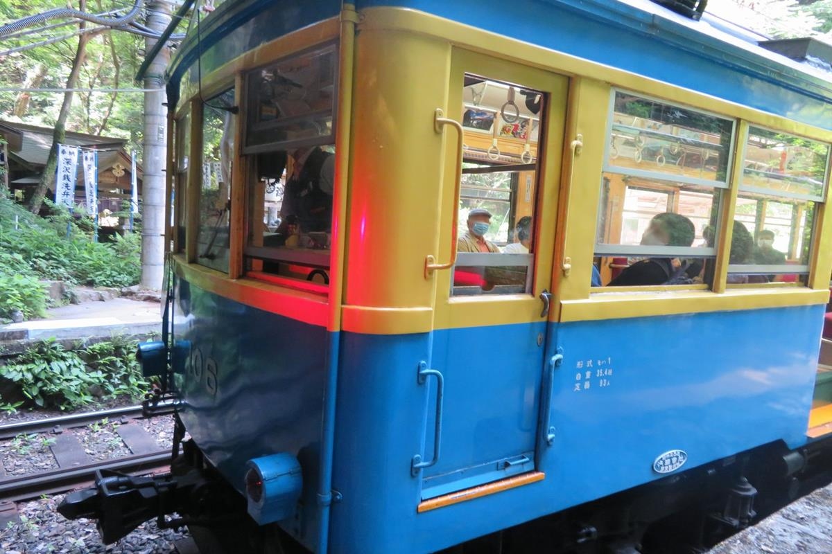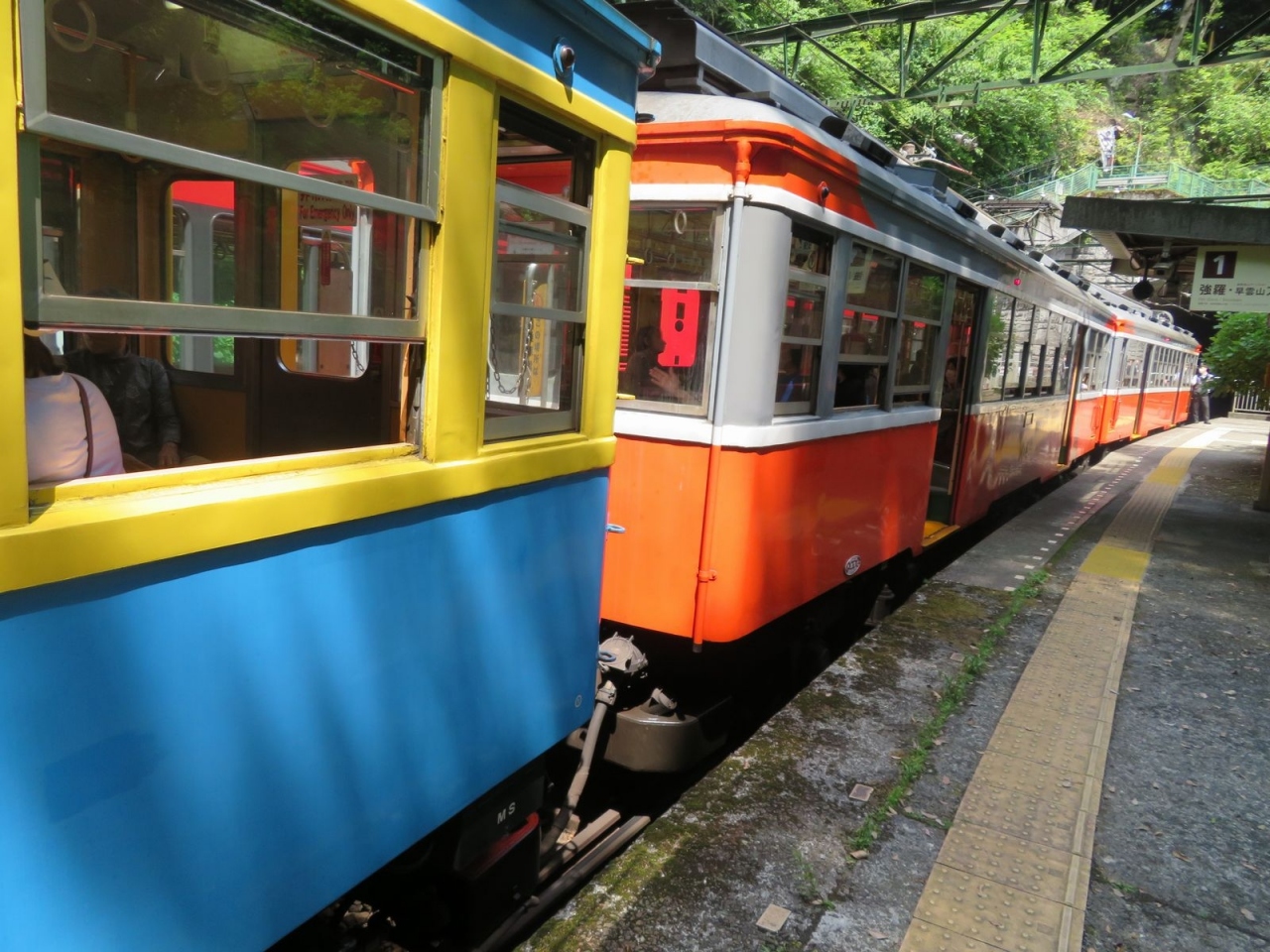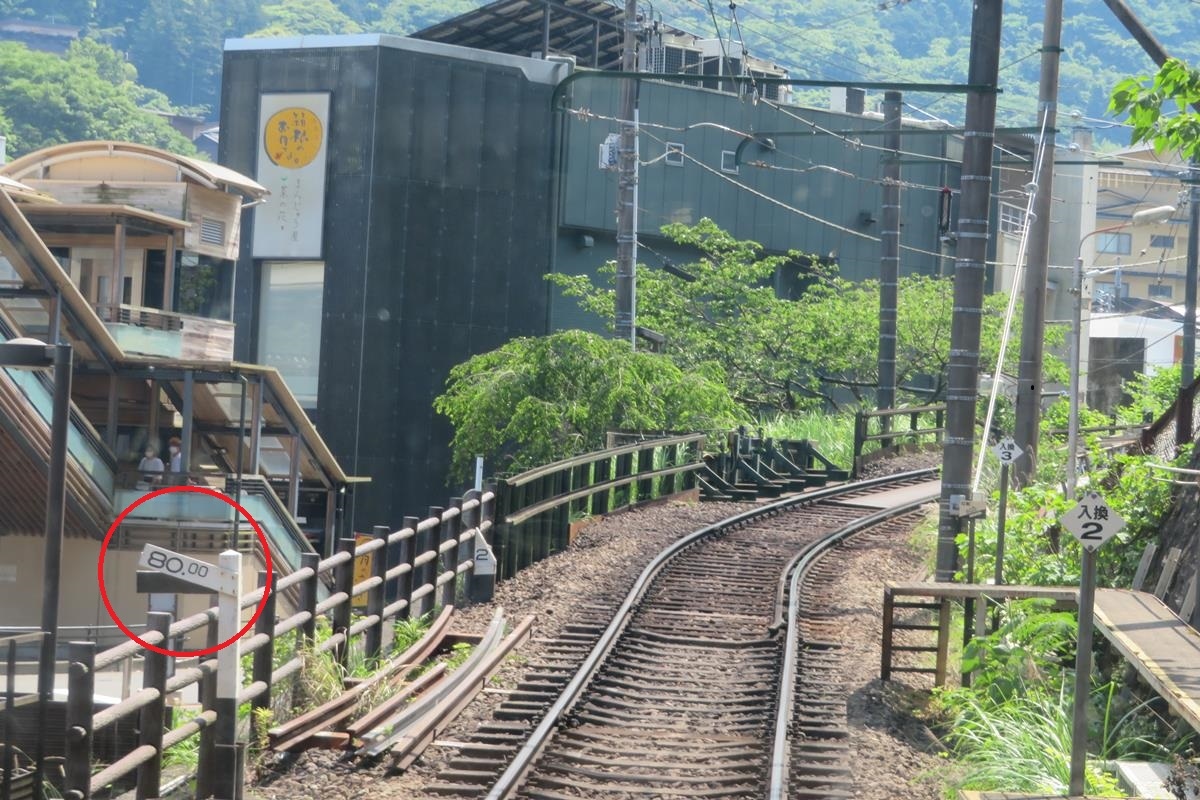 箱根湯本ー塔ノ沢間には80パーミル(1000m進む間に80mの勾配差)という鉄道で日本一の急勾配区間があって、急坂と急カーブをゆっくりと走ります。