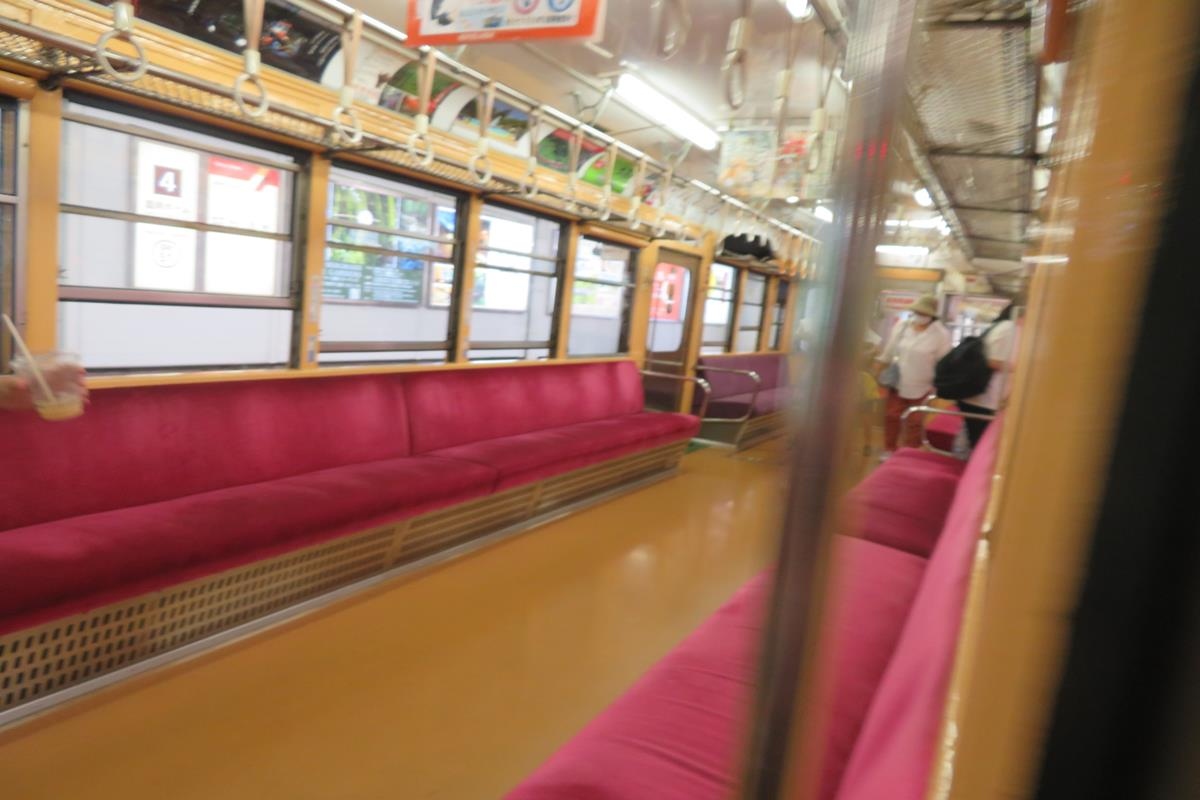 ロングシートが並ぶ車内にはエアコンなどなく、車内放送で「エアコンはありません。冷房付きは次の電車になります。」と案内されるくらい、今となっては貴重な一場面でした。
