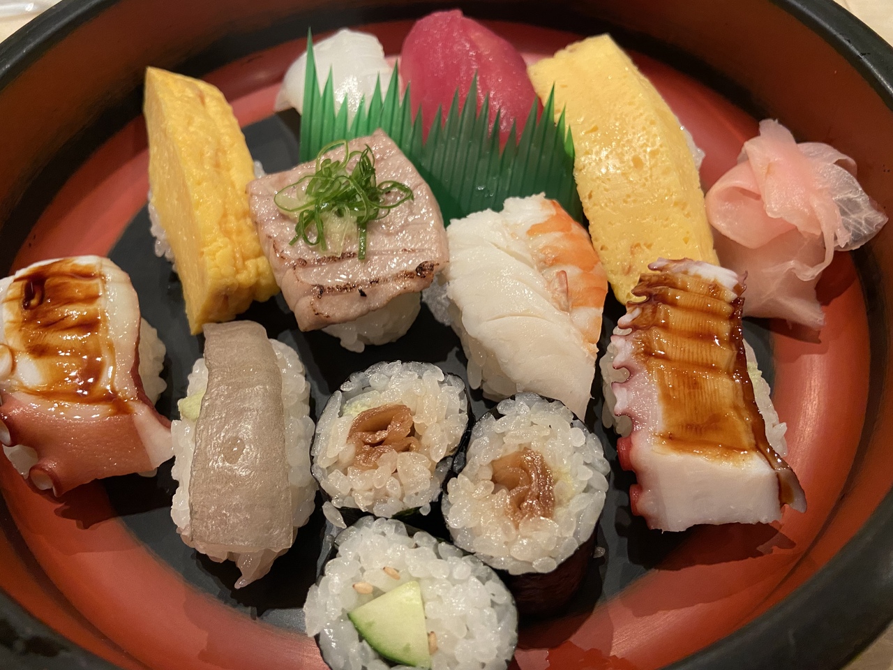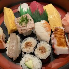 ちょっと良い感じの小径の奥にあるお寿司屋さんで、ランチを頂きました。お寿司9貫と、細巻き3貫に、細麺のきつねうどんが付くお得なセットを注文。カウンター、テーブル席、奥の方には個室があるような感じです。店内は清潔でおいしく頂きました。