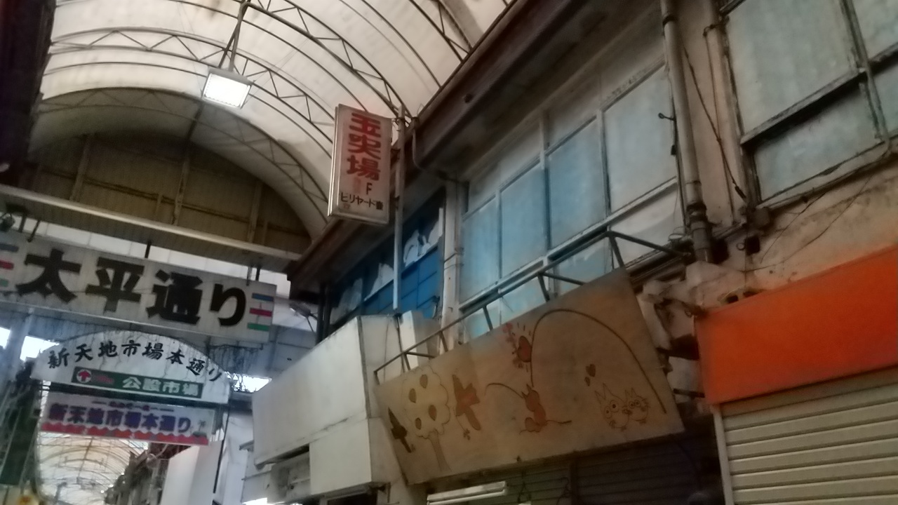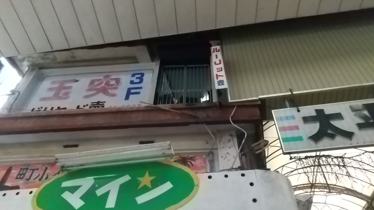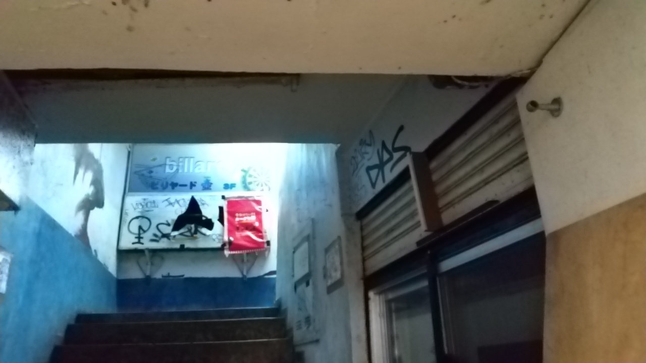 どこか懐かしさを感じるアーケードの商店街です。古い建物は裏側から見ると三階建てになっている場所もあり、ビリヤード(玉突き)は3階で営業しているような案内。