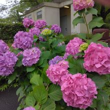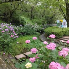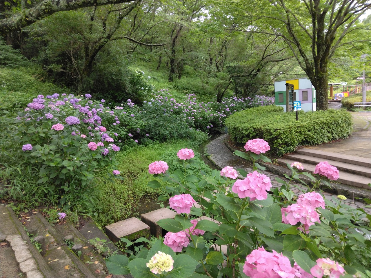 池の回り道を散策出来て、自転車も通らないので、安心して歩けます。藤棚の藤はさすがに終わっていましたが、駐車場の向かいになる所ではあじさいが、見頃でした。あちこちにカフェやレストランもあり、駐車場の一角にはスタバもあります。 池にはボートも!