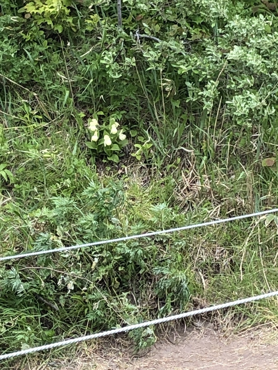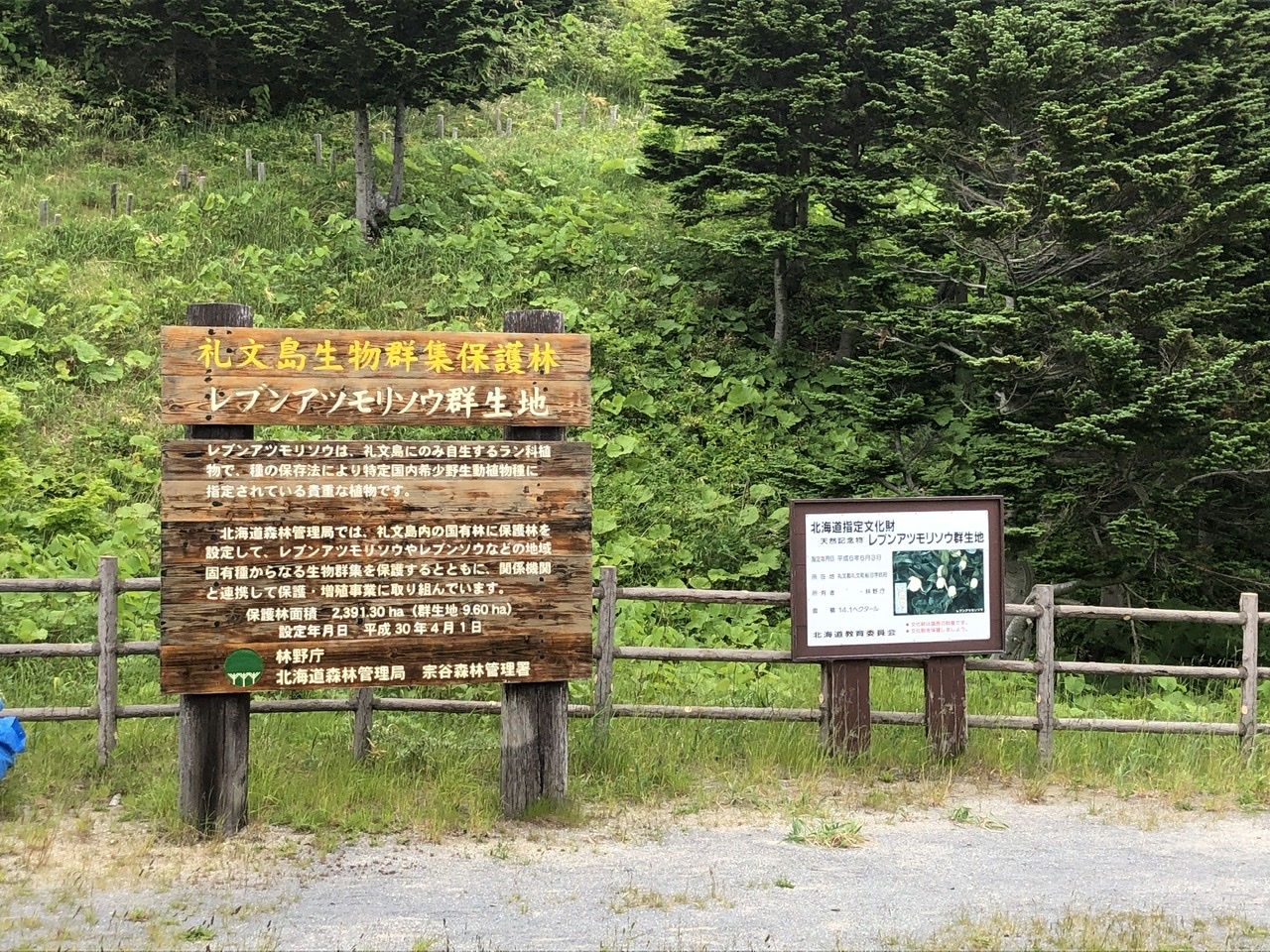 貴重な「レブンアツモリソウ」の群生地。私達が訪れた前日17時までオープンしていたのですが、花の期間が終了してしまい(1日遅くて間に合わず、)、ロープの外から鑑賞しました。花ガイドさんの説明でかろうじて、花を見つけることが出来ました。もしガイドさんが居なかったら、どれがレブンアツモリソウなのか分からずに帰ったと思います。少し離れていましたが、最後の花をいくつか見る事が出来ました。山の斜面にぽつんぽつんと白い花を見つけた時は、とても嬉しかったです。