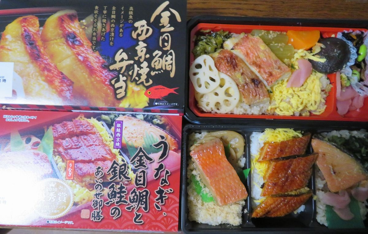 今回は東華軒の「金目鯛西京焼弁当」と「うなぎ、金目鯛と銀鮭のあいのせ御膳」を買って帰りました。