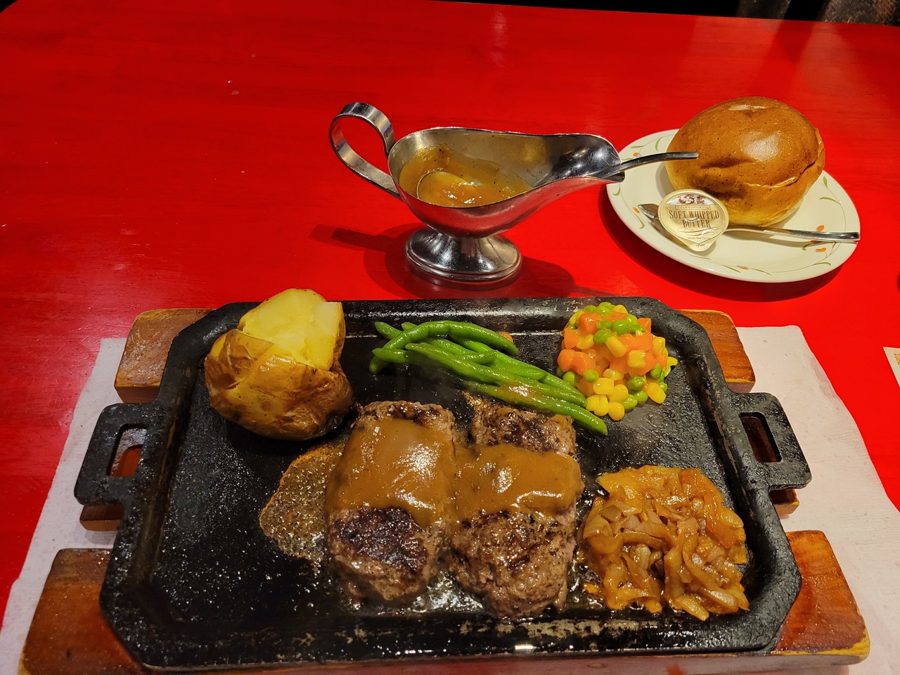平日13時過ぎでも並びます。40分ほどで入店。匂いだけで食欲倍増します。こちらのハンバーグはふわふわでジューシーなハンバーグではありません。荒々しい肉肉しいハンバーグです。