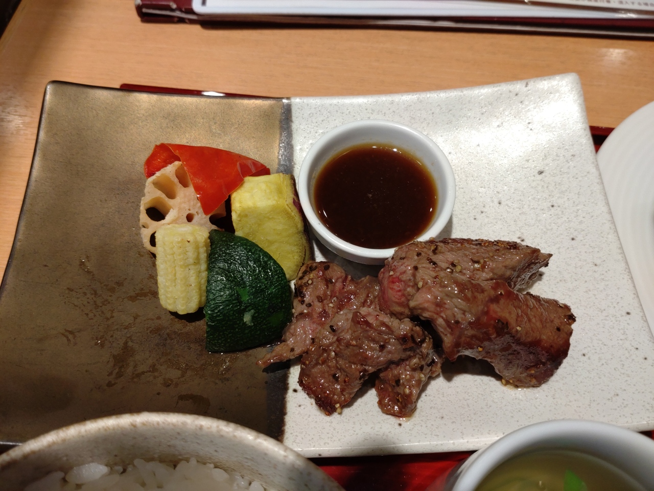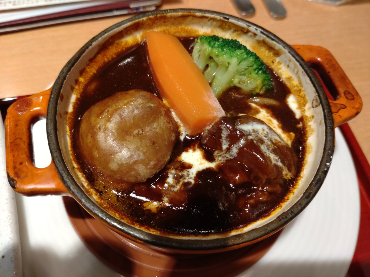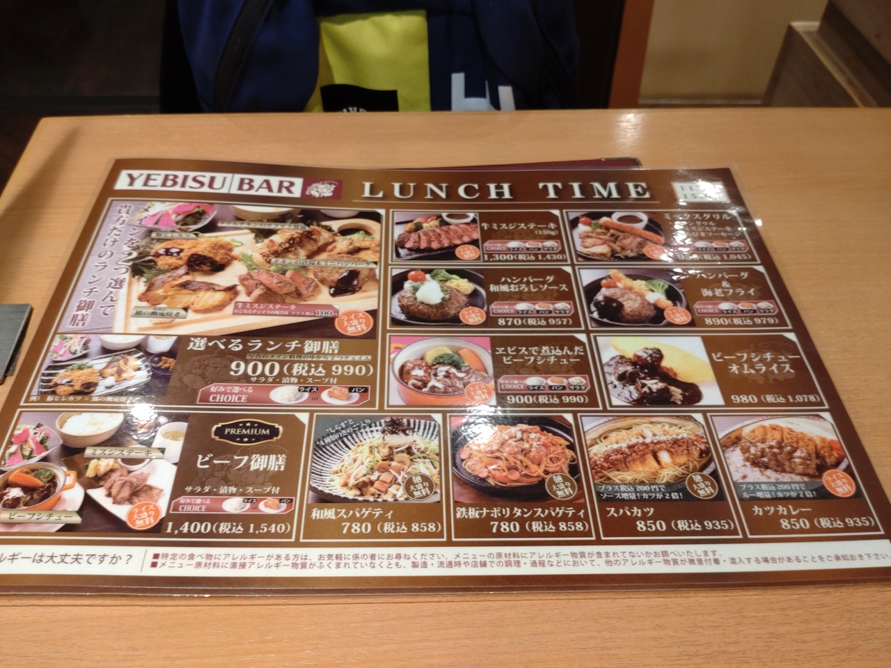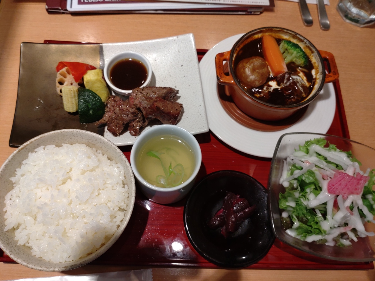 ランチは、1000円以下のメニューが多く、ビール飲まなくてももちろん自分OK。今回は少し贅沢してビーフシチューとミスジステーキがセットになった「ビーフ御膳」をオーダー。まず、エビスビール、さすがサッポロビールの最高級ブランド。味に間違いはなく、缶で飲むよりも更に美味しい気がします。ビーフシチュー、お肉が柔らかすぎず、硬すぎず。赤ワインを加えて時間をかけて煮込んだSTEWは、コクがあって美味。ミスジステーキは、お肉が柔らかく、脂にクドサガないのも良い。