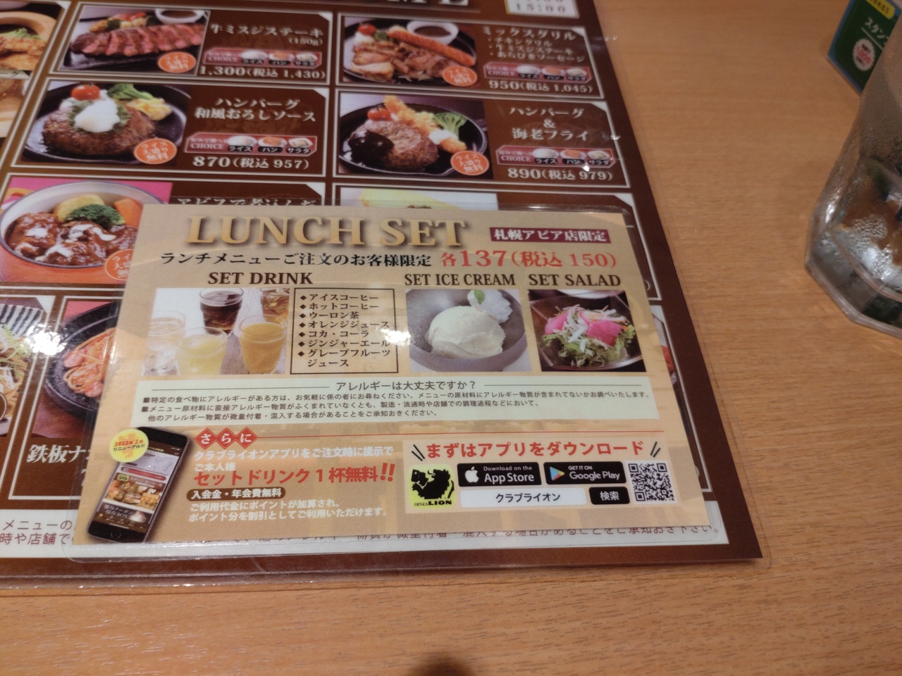札幌アピア店限定のサービス年で、ランチメニューを注文すると137円でドリンクかアイスクリーム、サラダがつけられる。また、アプリ提示でセットドリンク無料。満足粉のある休日のランチになりました。