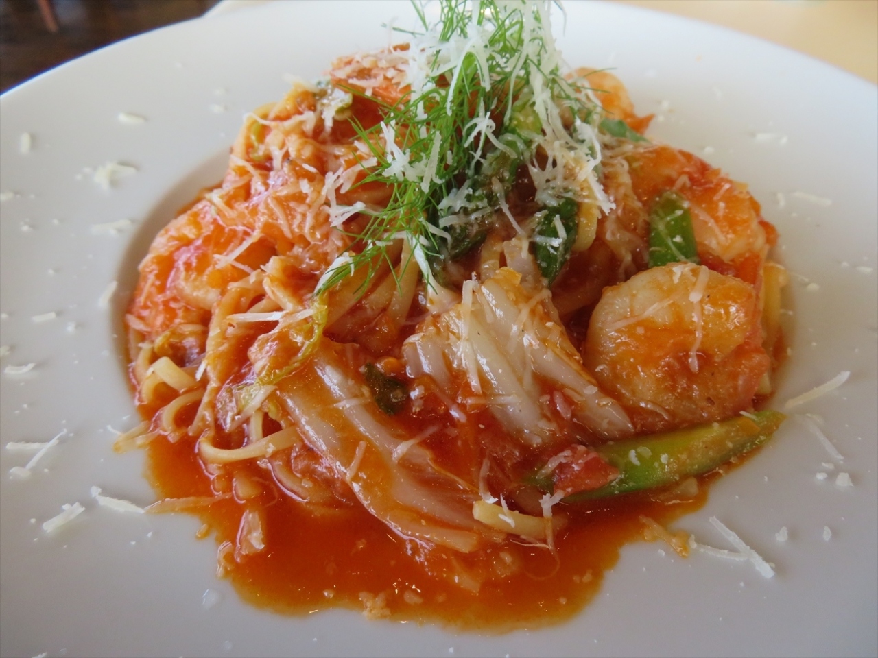 エビと春野菜のトマトソースパスタのセットは、サラダもパスタも味わいが薄口で、これもちょい残念でした。