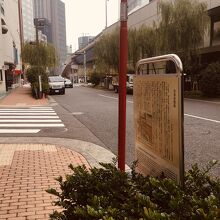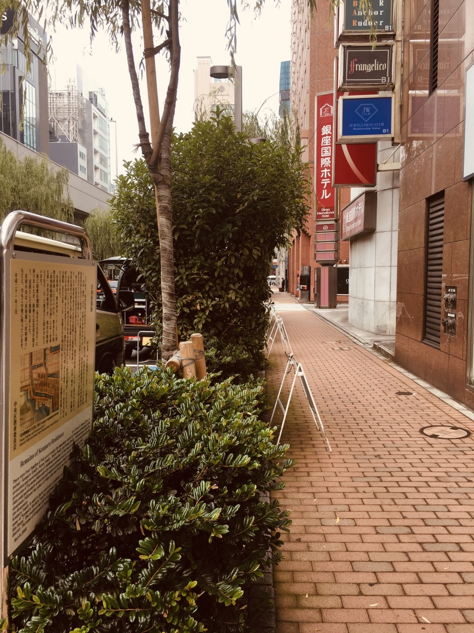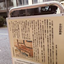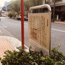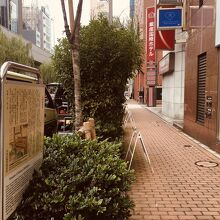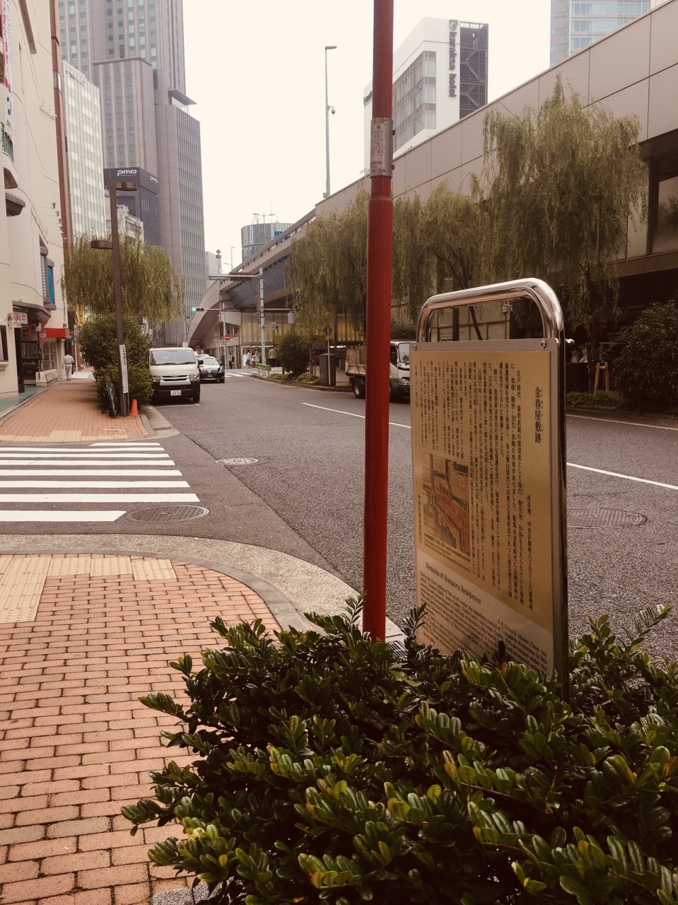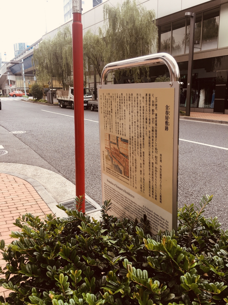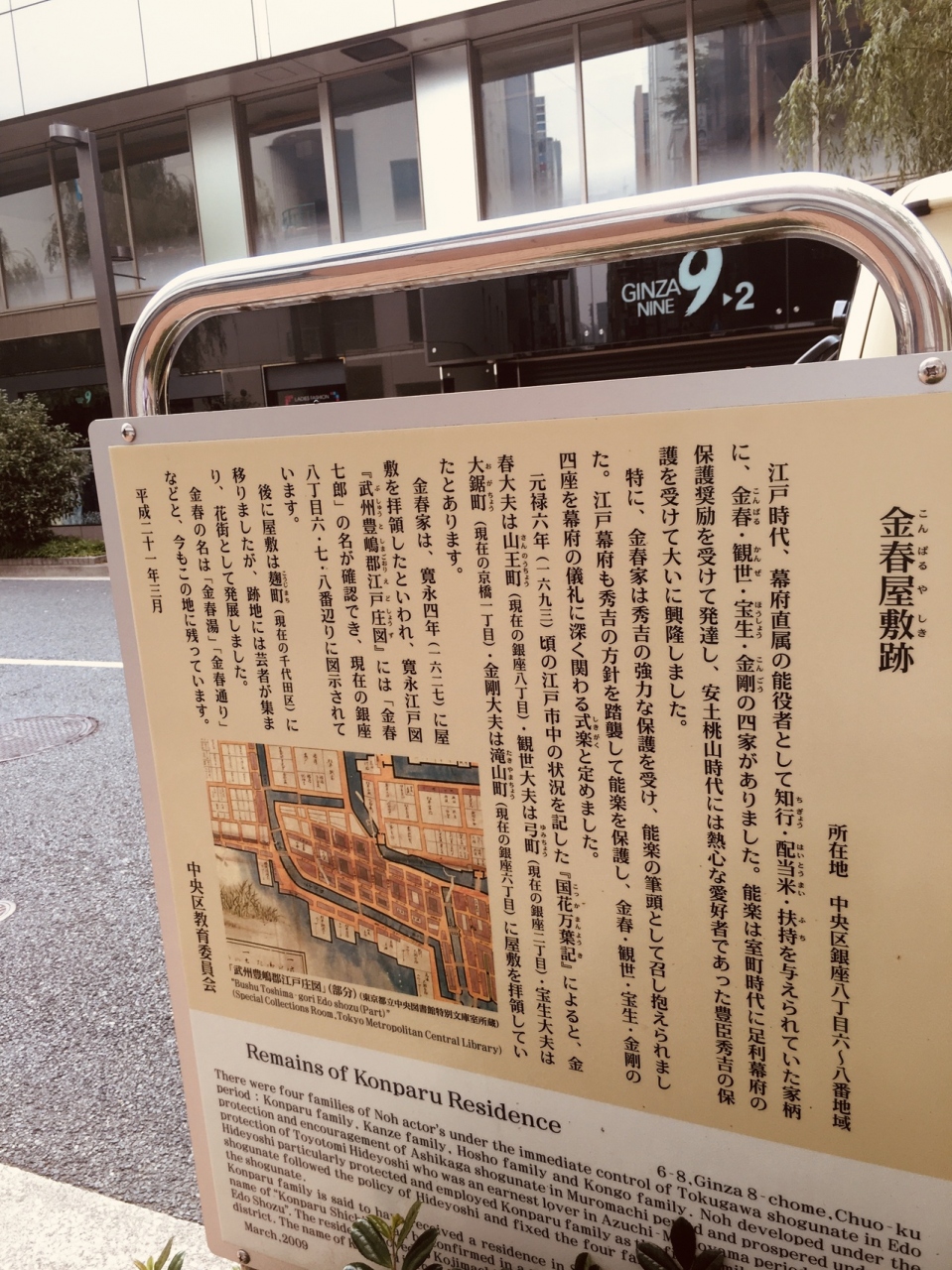 銀座御門通り沿いの舗道に説明看板がありました。前には草が生えていて側面はビルの狭い道沿いです。江戸時代の能役者の家でかなり大きなものとのことでした。看板には当時の地図も掲載、金春というは、通りの名前、銭湯の名前で今でも使われています。