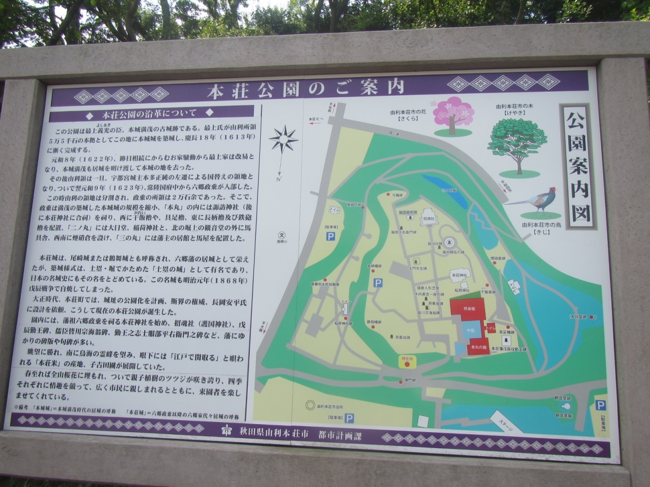 羽後本荘駅から徒歩10分ちょっと(1km弱)のところに本荘公園としてあります。