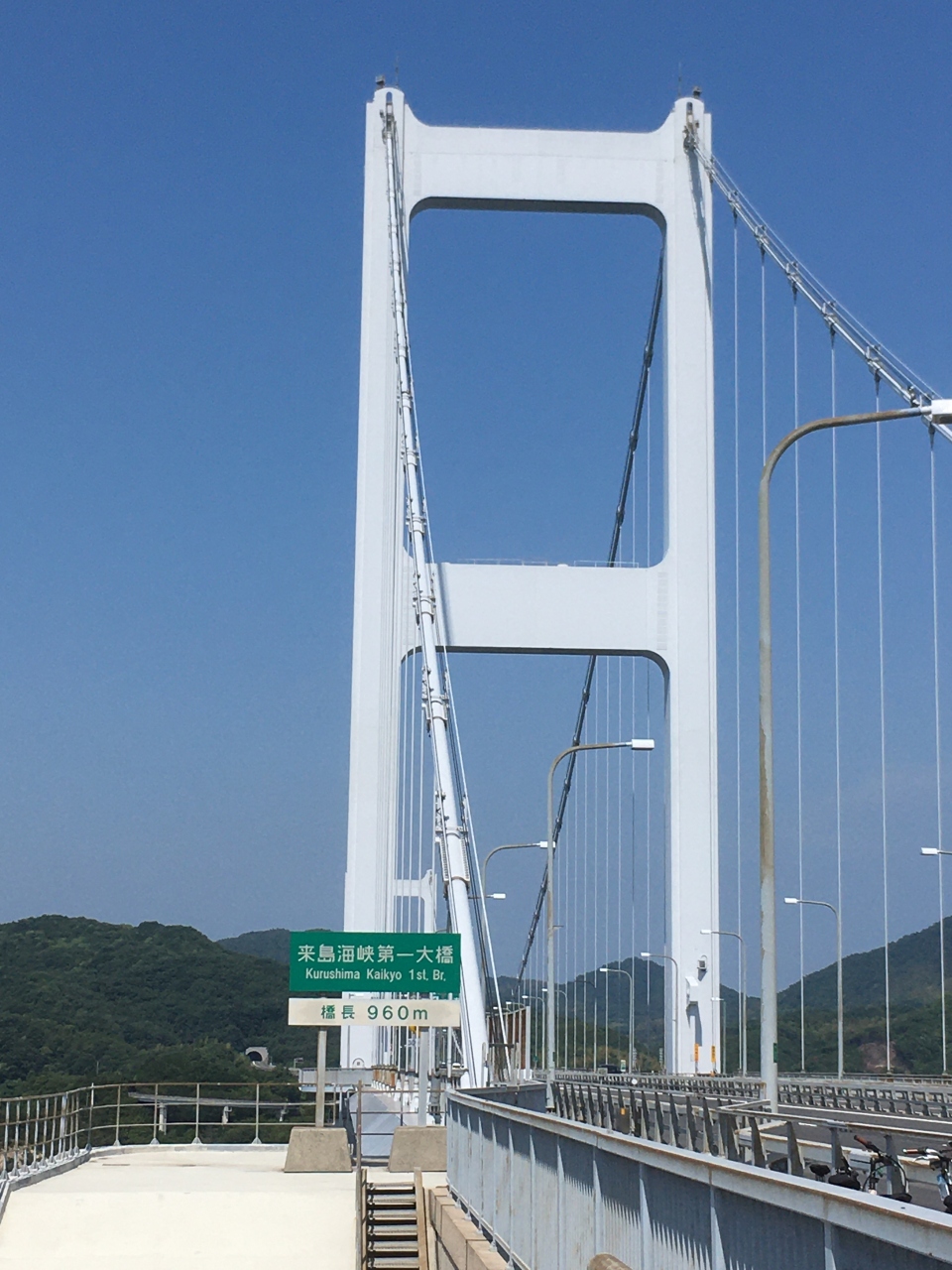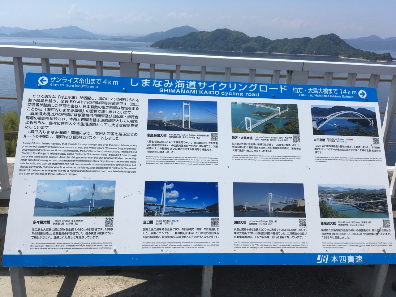 尾道から今治までしまなみ海道をサイクリングしてきましたが、一番今治側にある橋で、サンライズ糸山までは4キロの表示がありました。走っている時の景色も素晴らしいし、糸山公園から見る景色も素晴らしかったです。来島海峡は日本三大急流で、急流体験船に乗って潮流を間近で体験出来るそうなので、次回は是非体験してみたいと思いました。
