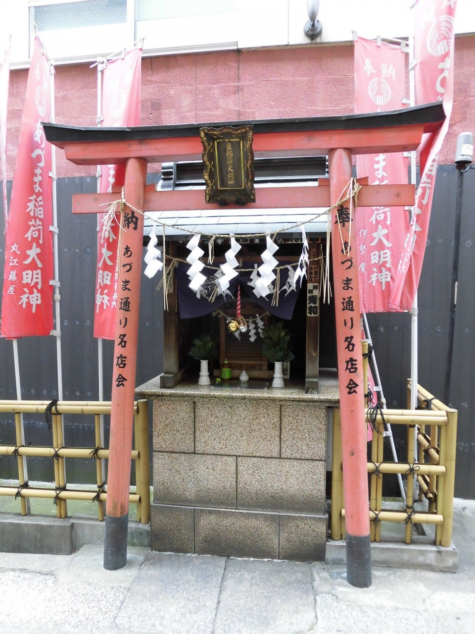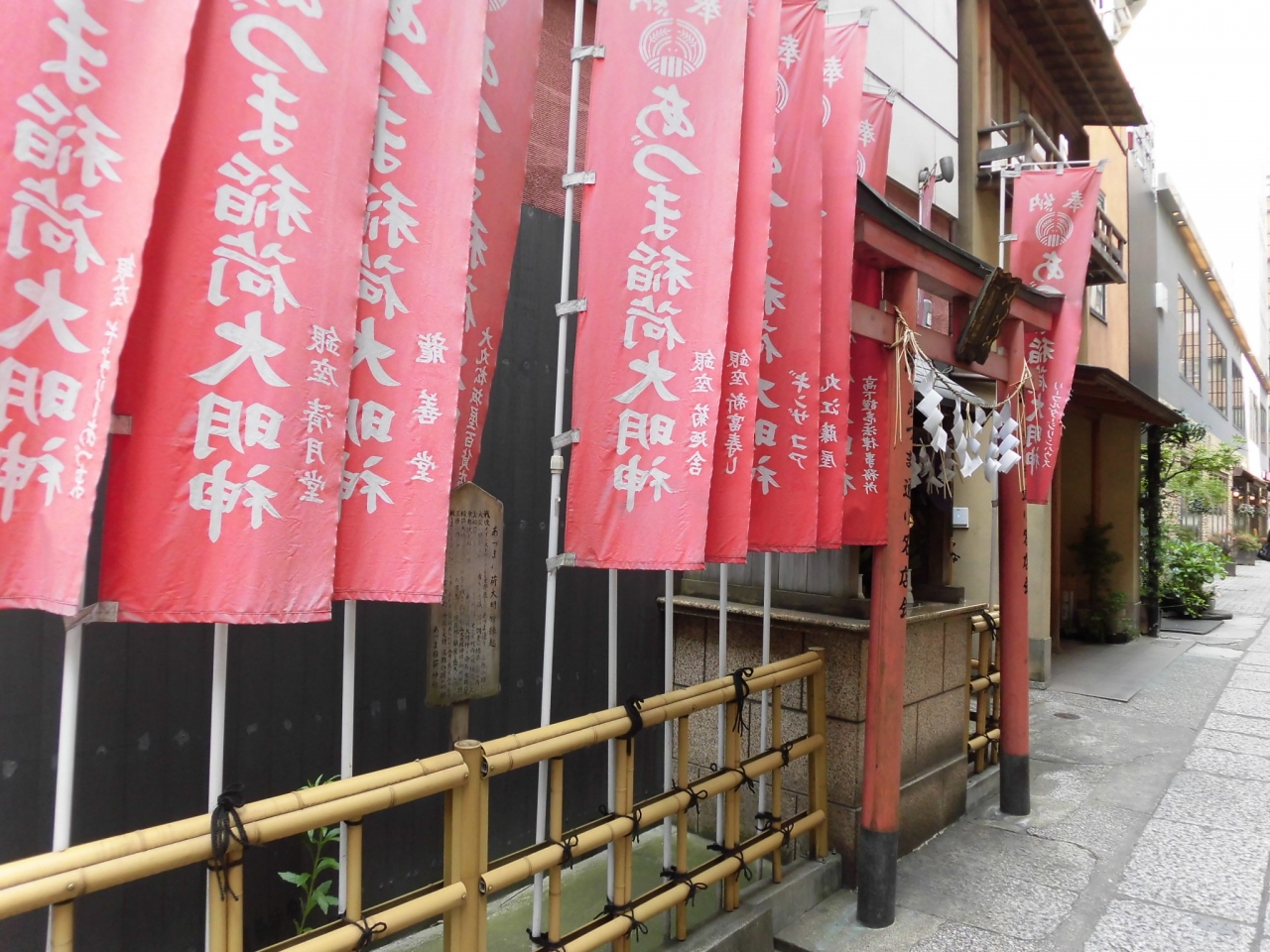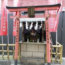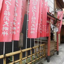 銀座周辺を散策しているときに、路地裏に稲荷神社があったので立ち寄りました。結構派手に赤い幟端が立てられていて、近所の方が大切にお守りしている様子でした。鳥居とお社は一見一体化しているようにも見えて、境内などはありませんでした。