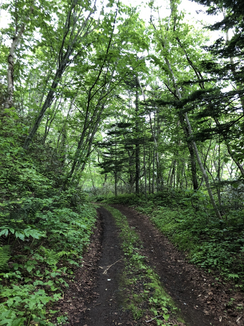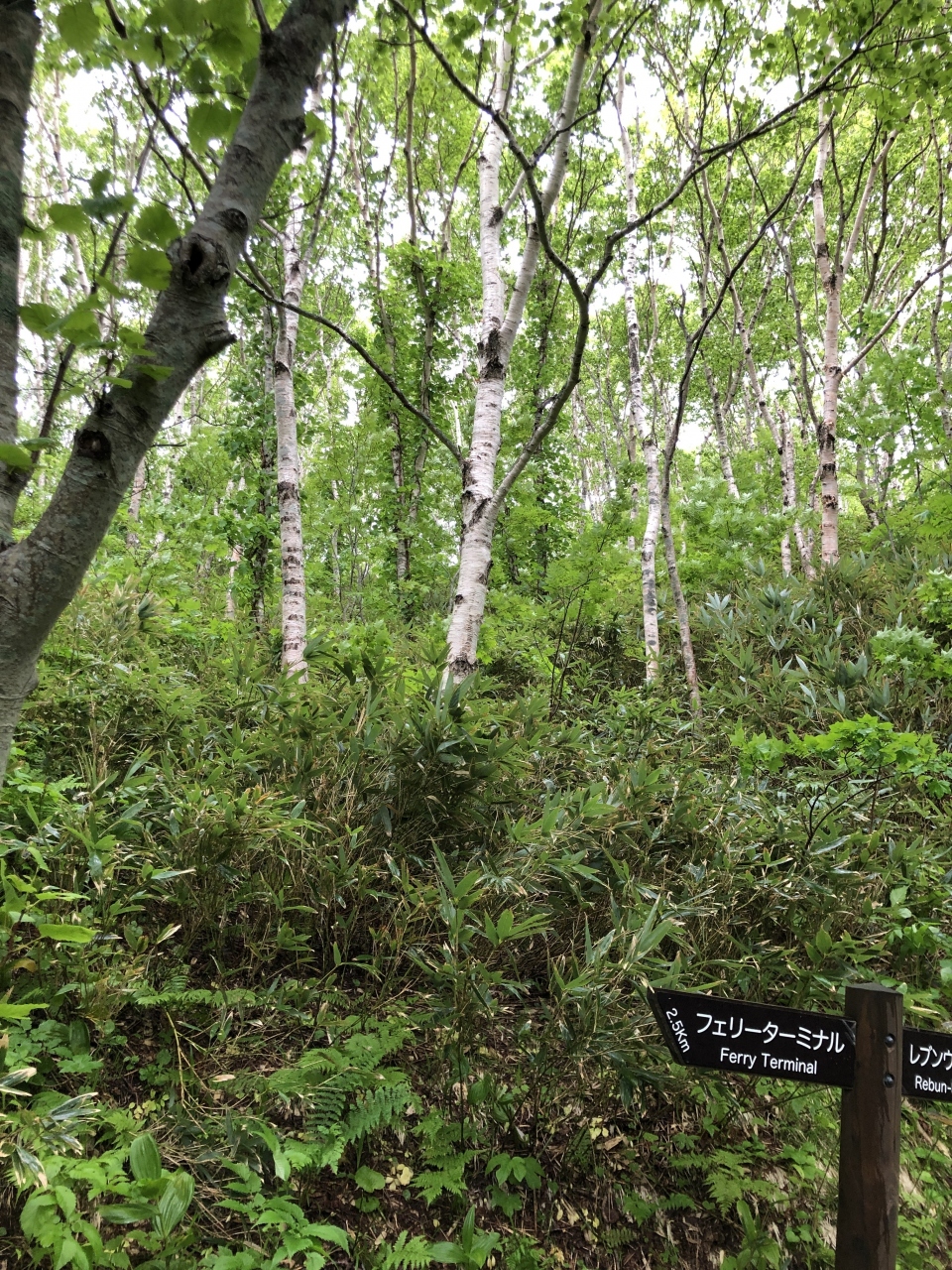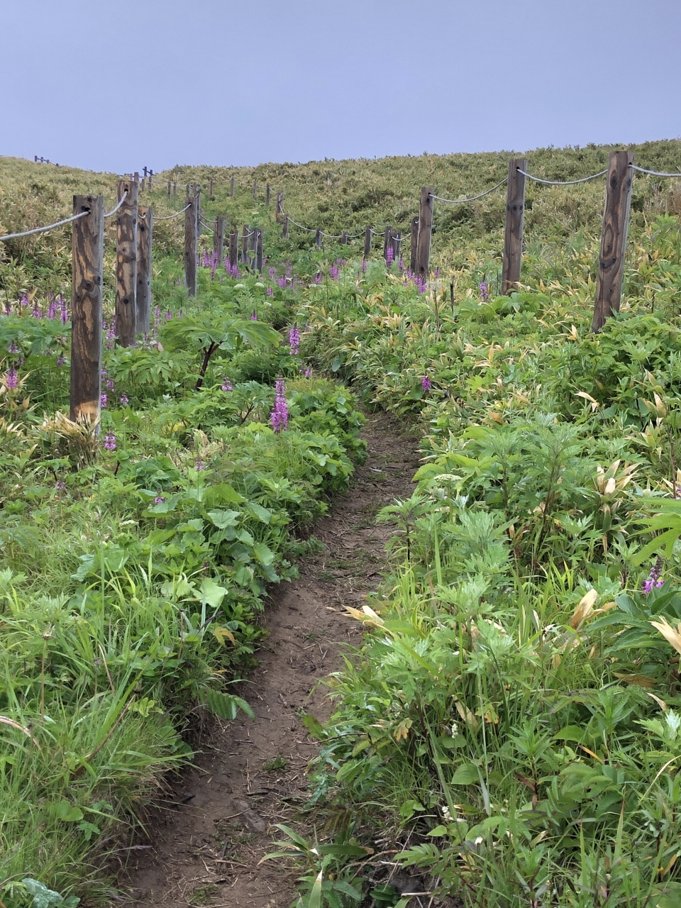 8Km3時間のコースをガイドさんとともに歩きました。このコースは花を見るというよりは礼文の生態系を見るコースです。下の方は木が茂って森の中を歩く感じ。標高200mあたりで森林限界となり、その後は原野を歩きます、原野は風を遮るものがないので、寒く感じました。6月は霧が多いとのことで、私たちが行った日も朝から霧・小雨の中をカッパを着て歩きました。コースとしてはゆるい登りが1時間、平坦な道を1時間、ゆるい下りを1時間で合計3時間という時間配分となりました。体力がある方ならもっと早く歩けると思います。でもツアー客30名全員完歩できました。所々に咲く花を見ながら歩くのもとても楽しかったです。