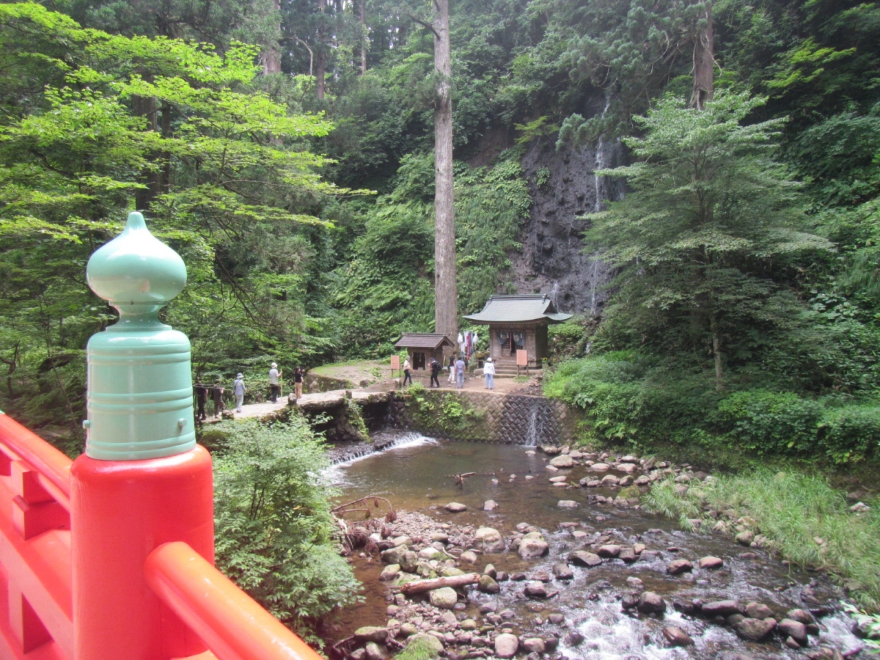 道路沿いの羽黒山神社の随神門を抜け、参道の石段を30mほど下の祓川の渓谷に下り、神橋を渡ろうとすると橋上からも見える滝です。