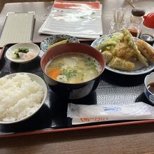団子汁、とり天、天ぷらがセットになった陽だまり定食